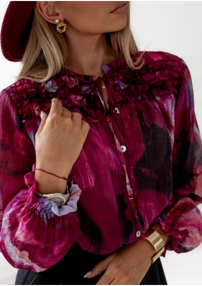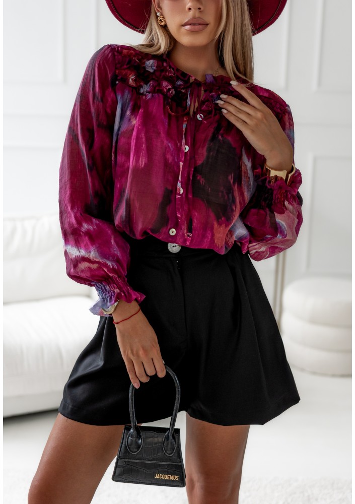Bluzka firmy Simplicity w bordowym princie. Bluzka ze zdobioną, wiązaną stójką. Zapinana na guziki. Delikatna falbanka zdobi dekolt. Mankiet przeszyty gumo-nićmi, co tworzy falbankę na końcu rękawa.