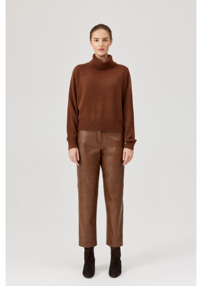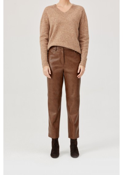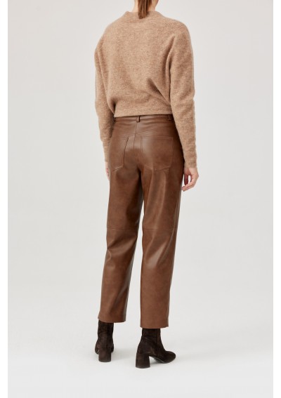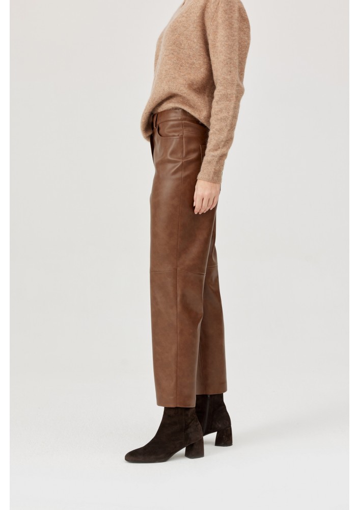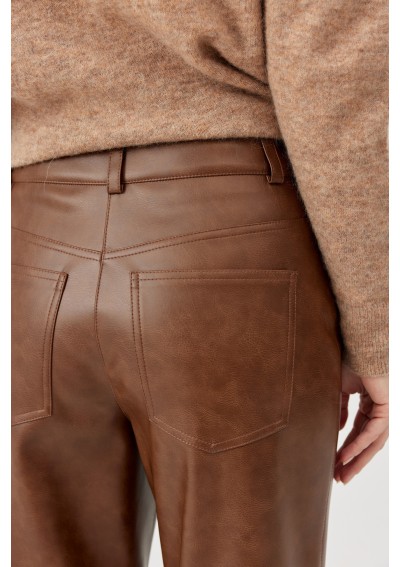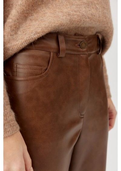 Spodnie z eko-skóry polskiej marki FERIA w kolorze brązowym. Model z prostą nogawką 7/8.