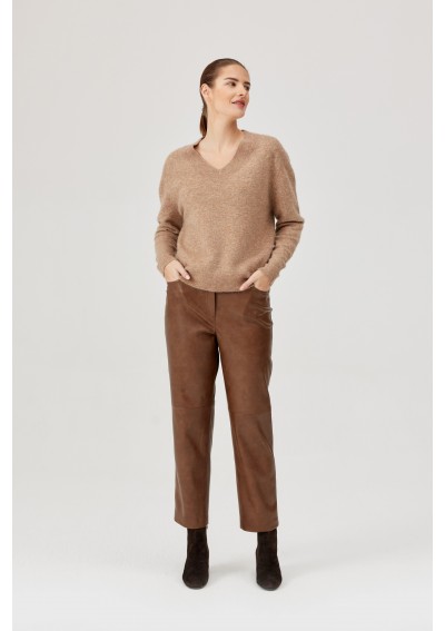 Brązowe spodnie o prostym kroju i lekko zwężanych nogawkach, wykonane z gładkiego materiału imitującego skórę. Klasyczne zapięcie na guzik i suwak oraz kieszenie po bokach, nadają im ponadczasowy charakter.
