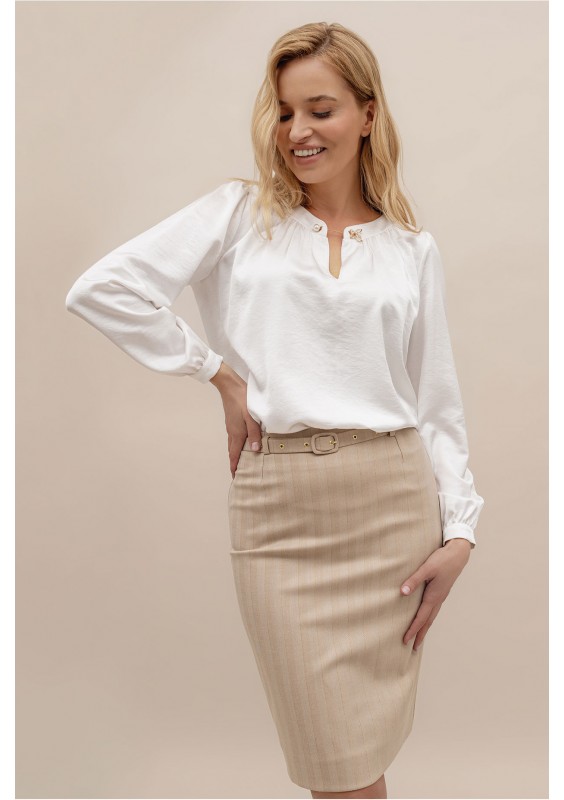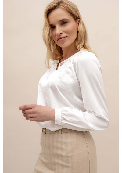 Biała koszula z długim rękawem i ciekawym zapięciem przy dekolcie. Swobodny krój. W takiej bluzce na pewno się wyróżnisz !