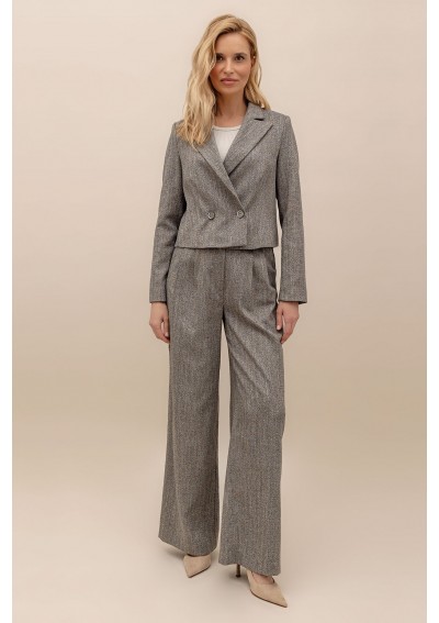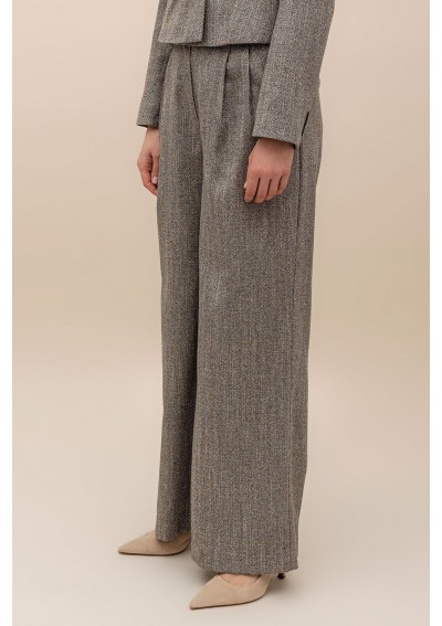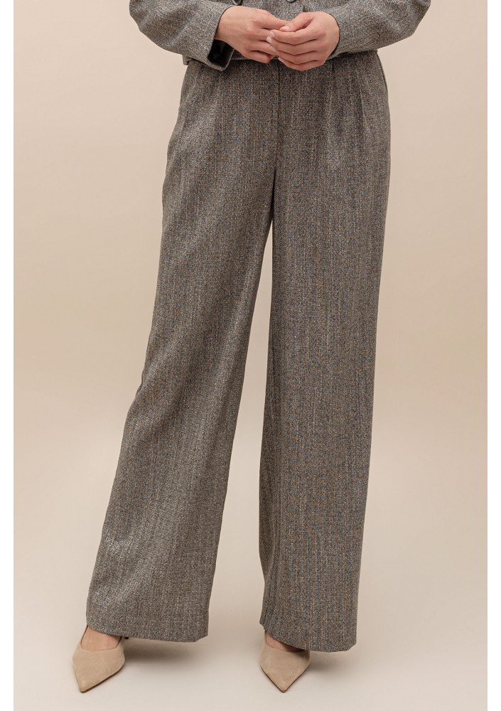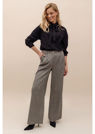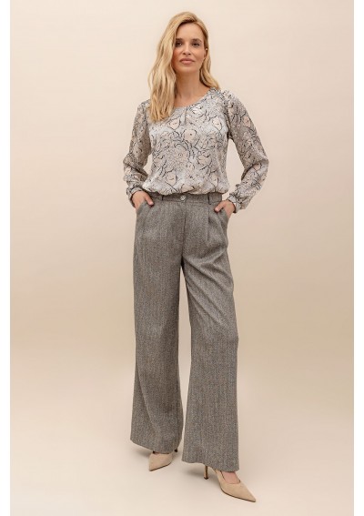 Spodnie z szeroki nogawkami, wykonane z tkaniny o delikatnym, melanżowym wzorze. Spodnie z kieszeniami po bokach. Zapinane na suwak i na guzik. Wysoki stan.