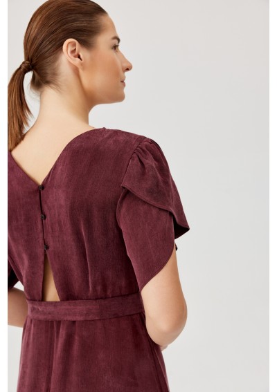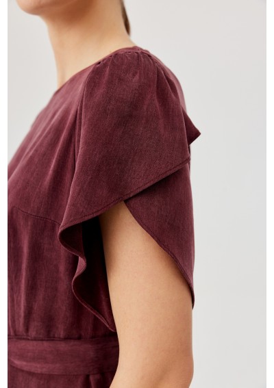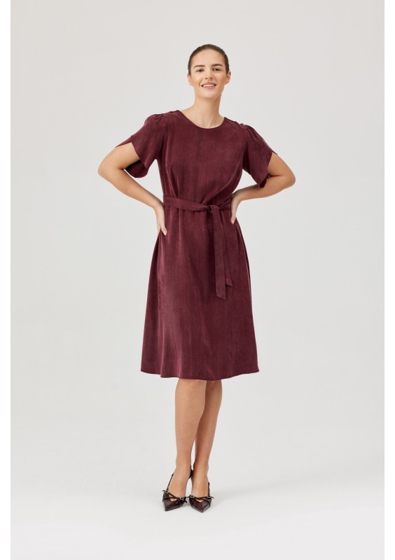 Bordowo-śliwkowa sukienka damska o klasycznym kroju to elegancka propozycja na wiele okazji. Wykonana z lekkiego materiału, pięknie układa się na sylwetce, zapewniając wygodę i swobodę ruchów. Krótkie, delikatnie i ciekawe rękawy nadają jej dziewczęcego uroku, a pasek w talii podkreśla kobiece kształty. Sukienka posiada efektowne wycięcie i zapięcie na guziki z tyłu, co dodaje jej subtelnej zmysłowości. Długość midi sprawia, że model świetnie sprawdzi się zarówno na co dzień, do pracy, jak i na wyjątkowe wyjścia.