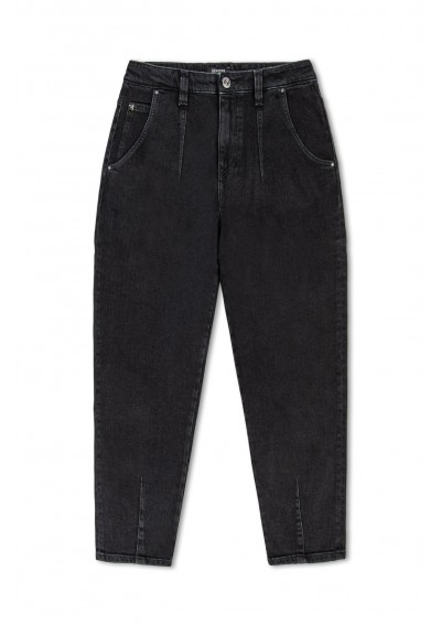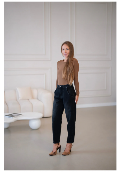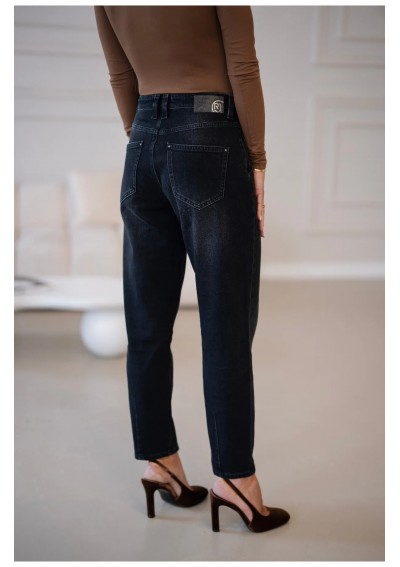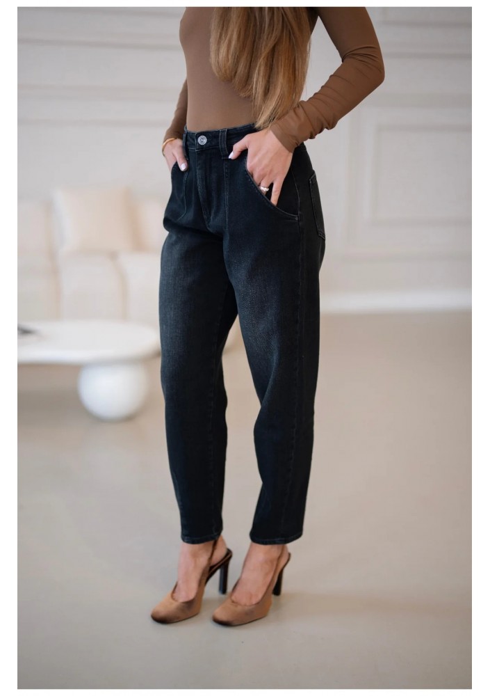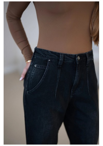 Czarne jeansy z wysokim stanem. Wykonane w kaszmirowym chwycie. Zaszewki na przodzie i na dole nogawki sprawiają, że spodnie będą pasować do wielu stylizacji. Dzięki zastosowaniu w tkaninie ''Lycry T400" spodnie nie tracą swojego kształtu oraz formy.