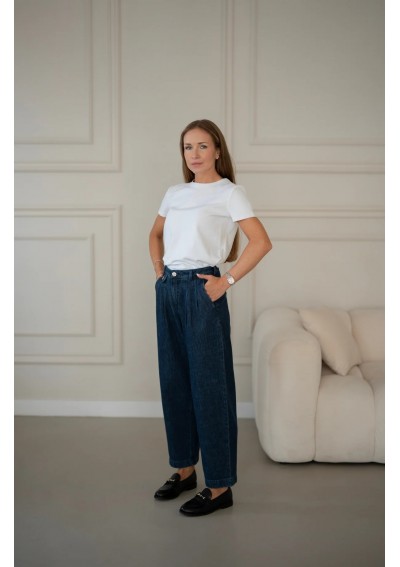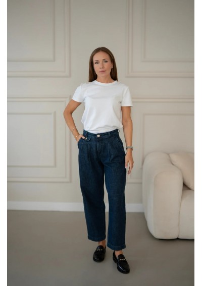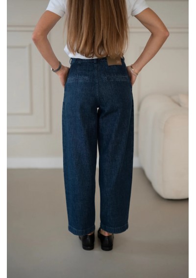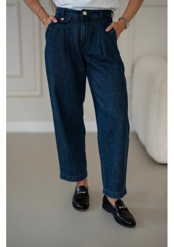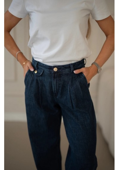 Granatowe spodnie jeansowe o luźniejszym kroju to doskonała propozycja dla kobiet ceniących wygodę i ponadczasowy styl. Wysoki stan z ozdobnymi guzikami pięknie podkreśla talię, a delikatne zakładki nadają im eleganckiego charakteru. Nogawki o prostym fasonie świetnie układają się na sylwetce i zapewniają swobodę ruchów. Jeansy w klasycznym, ciemnym odcieniu granatu są niezwykle uniwersalne – sprawdzą się zarówno w stylizacjach casualowych z T-shirtem i trampkami, jak i w eleganckim zestawieniu z koszulą oraz mokasynami. To spodnie, które z łatwością wpiszą się w garderobę kapsułową i będą bazą wielu stylizacji przez cały rok.
