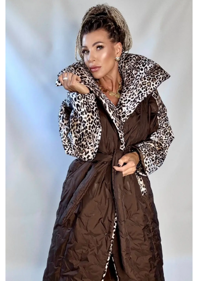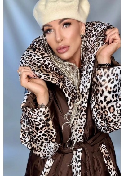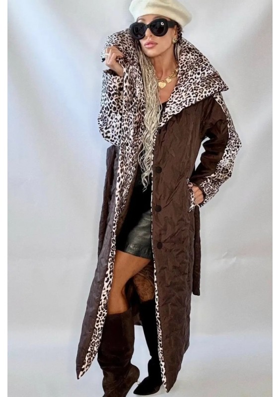 Brązowy długi płaszcz, z dodatkiem pantery. Posiada wysoki kołnierz oraz pasek. Zapinany na napy. Polski producent ZELE.