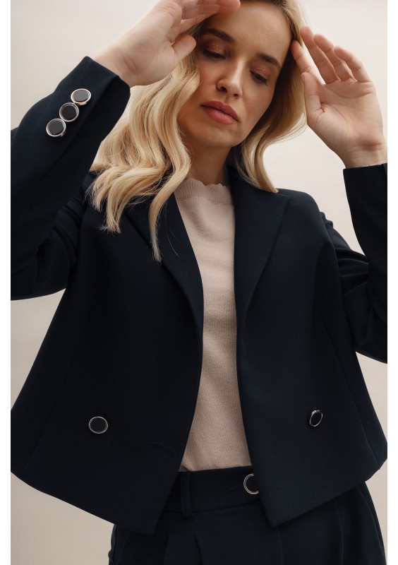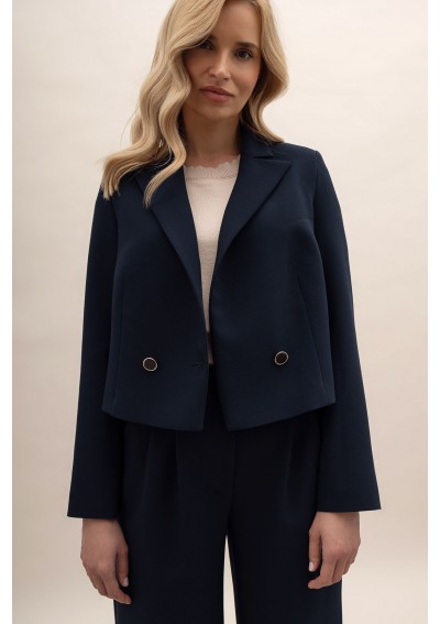 Elegancka marynarka damska w kolorze granatowym, idealna zarówno do biura, jak i na wyjątkowe okazje. Krótszy fason z minimalistycznym zapięciem na ozdobne guziki dodaje nowoczesnego charakteru. Wysokiej jakości tkanina gwarantuje komfort noszenia oraz trwałość. Marynarka świetnie komponuje się ze spodniami w komplecie, tworząc stylowy garnitur, ale równie dobrze wygląda w duecie z jeansami czy spódnicą. To must-have w kapsułowej garderobie każdej kobiety.