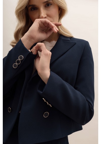 Granatowa marynarka dwurzędowa o krótszym fasonie z ozdobnymi guzikami z przodu i na rękawie. Posiada również ozdobną podszewkę.