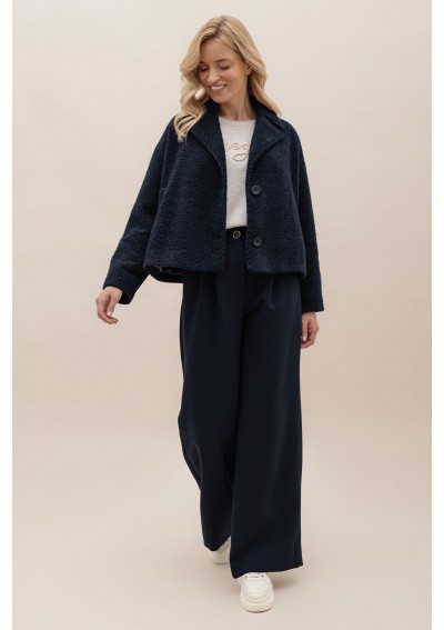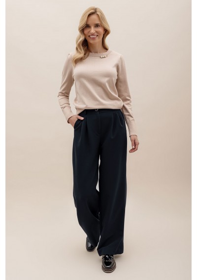 Eleganckie spodnie damskie w kolorze granatowym, o prostym i szerokim kroju, które optycznie wydłużają sylwetkę. Wysoki stan z ozdobnym guzikiem podkreśla talię, a zakładki z przodu dodają klasy i lekkości. Model wykonany z wysokiej jakości tkaniny gwarantuje komfort noszenia i idealnie sprawdzi się zarówno w zestawach biurowych, jak i w casualowych stylizacjach z t-shirtem czy swetrem. Świetnie prezentują się również w komplecie z marynarką, tworząc nowoczesny garnitur.