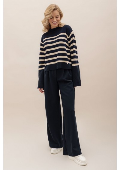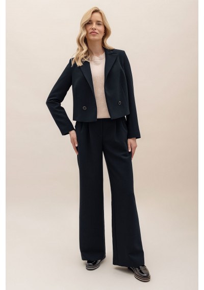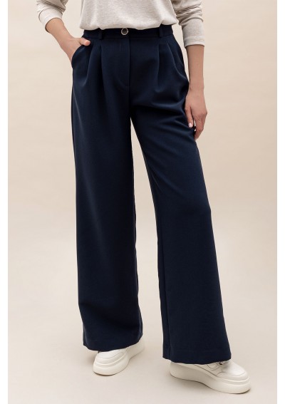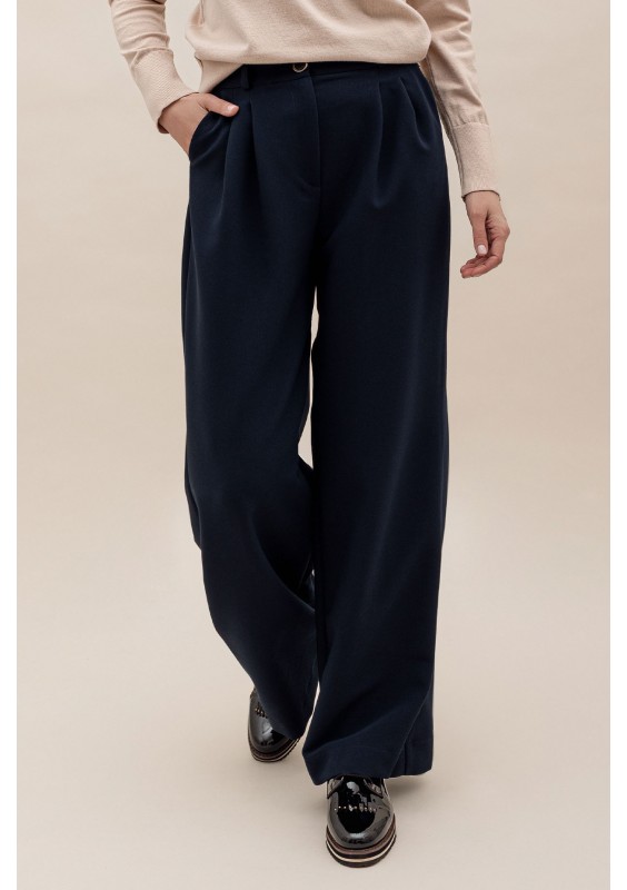 Granatowe spodnie z szeroką nogawką i wysokim stanem. Spodnie posiadają kieszenie. Tworzą spójny garnitur z marynarką Merano.