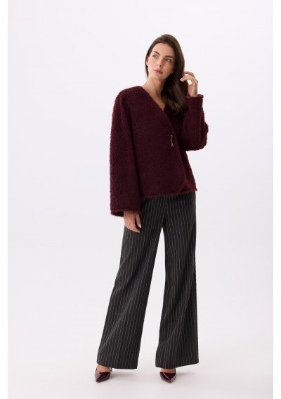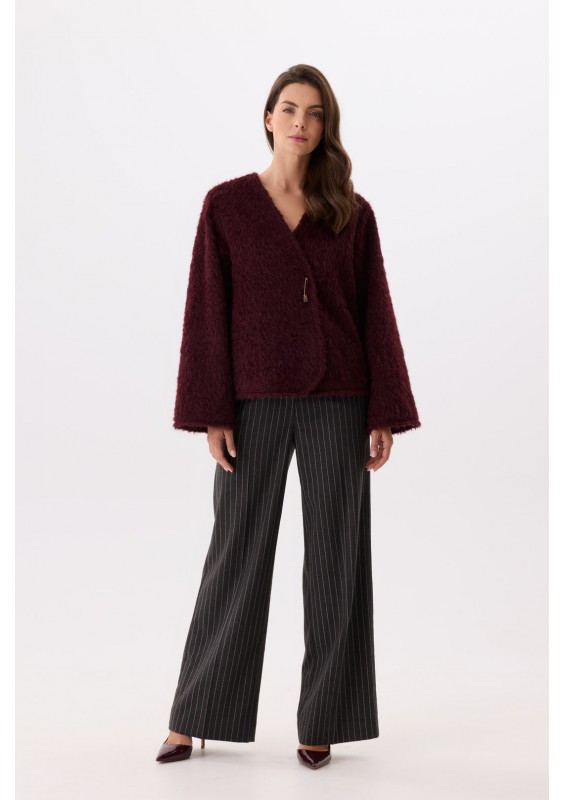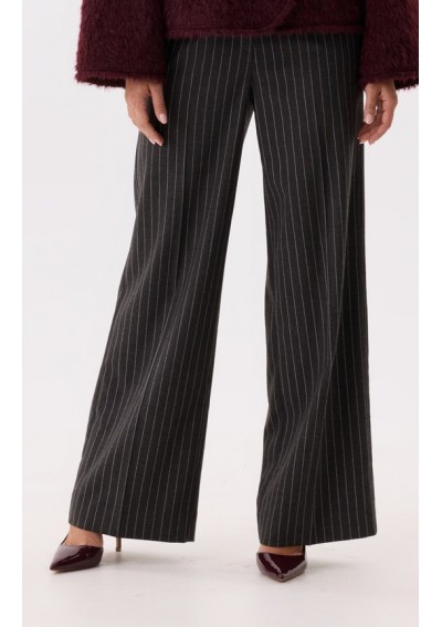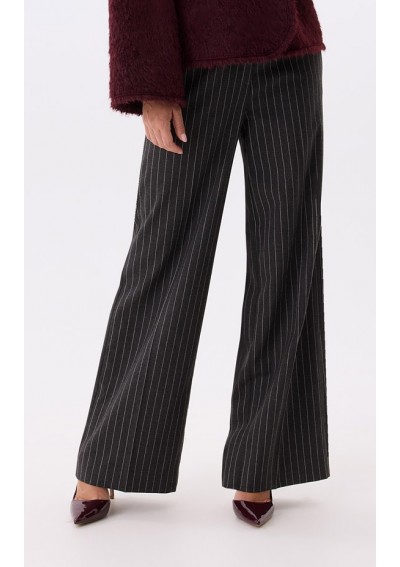 Stylowe spodnie damskie z szeroką nogawką w modny wzór w pionowe paski to propozycja dla kobiet, które cenią elegancję i wygodę. Model w odcieniu ciemnej szarości z białymi prążkami optycznie wysmukla sylwetkę i wydłuża nogi. Spodnie o luźnym kroju zapewniają swobodę ruchów i komfort noszenia przez cały dzień. Doskonale sprawdzą się zarówno w biurowych stylizacjach, jak i podczas bardziej formalnych okazji. Idealne w zestawie z koszulą, eleganckim topem czy sweterkiem.