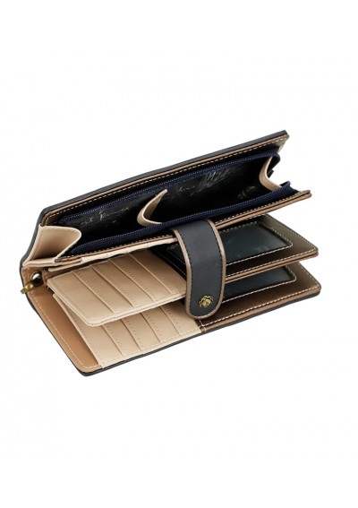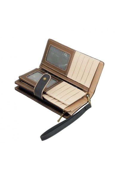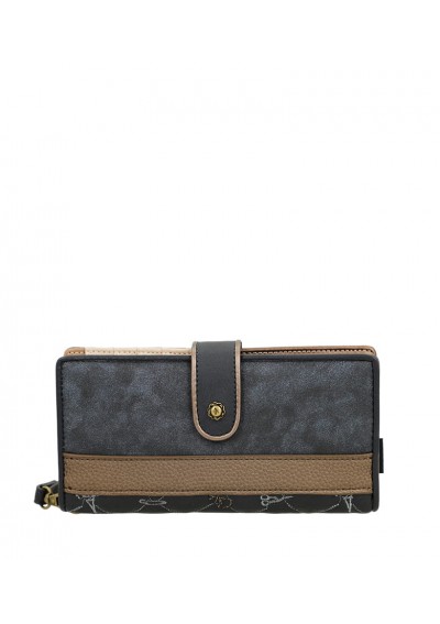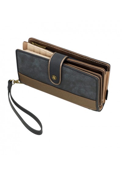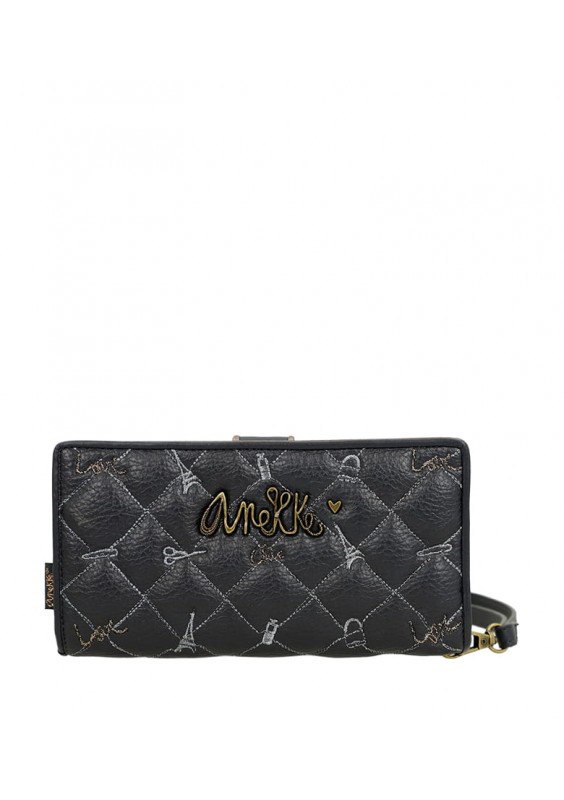 Wnętrze portfela zostało zaprojektowane z myślą o komforcie użytkowania: liczne przegródki na karty, dokumenty i zdjęcia, kieszeń na monety zapinaną na suwak oraz dodatkowy pasek na nadgarstek. Całość zamykana na zatrzask, z charakterystycznym metalowym logo Anekke na froncie.