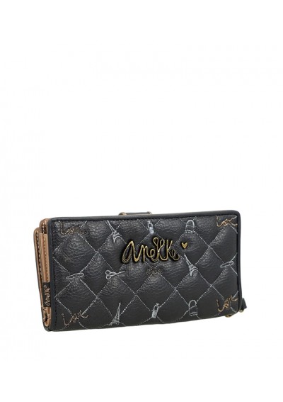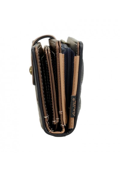 Duży portfel hiszpańskiej marki Anekke z kolekcji Mademoiselle, linia Botique. Portfel posiada jedną kieszeń, podzieloną na dwie częsci, zapinaną na zamek komorę na bilon. Z drugiej strony znajdziemy 4 skrzydła na karty oraz zdjęcia. Jedna duża komora na banknoty.