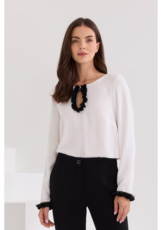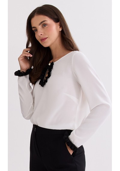 Biała bluzka o prostym kroju, ozdobiona łezką z czarnego tiulu. Rękawy wykończone czarnym tiulem. Półokrągły dekolt. Polska marka Salko.