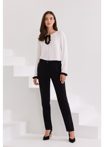 Subtelna, a jednocześnie wyjątkowo elegancka biała bluzka z ozdobną czarną falbanką przy dekolcie to idealna propozycja do pracy, na spotkanie lub wyjątkowe okazje. Dekolt w kształcie łezki z delikatnym zdobieniem dodaje szyku, a mankiety wykończone falbanką nadają całości kobiecego charakteru. Bluzka została wykonana z lekkiej, zwiewnej tkaniny, która pięknie układa się na sylwetce i gwarantuje komfort noszenia przez cały dzień. Doskonale komponuje się zarówno z eleganckimi spodniami, jak i ołówkową spódnicą.