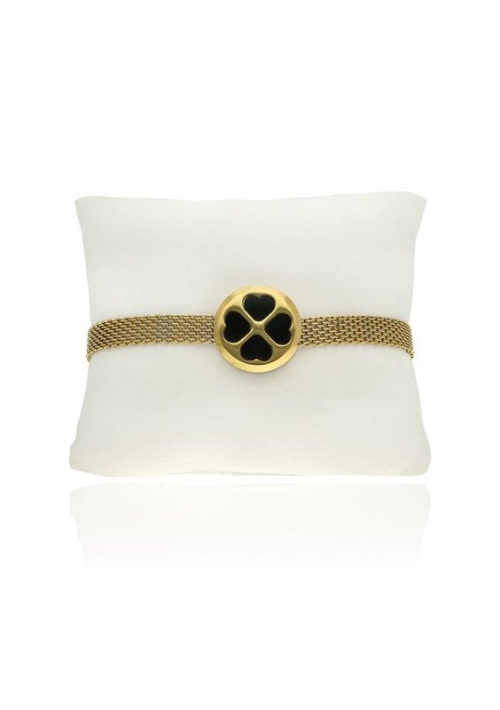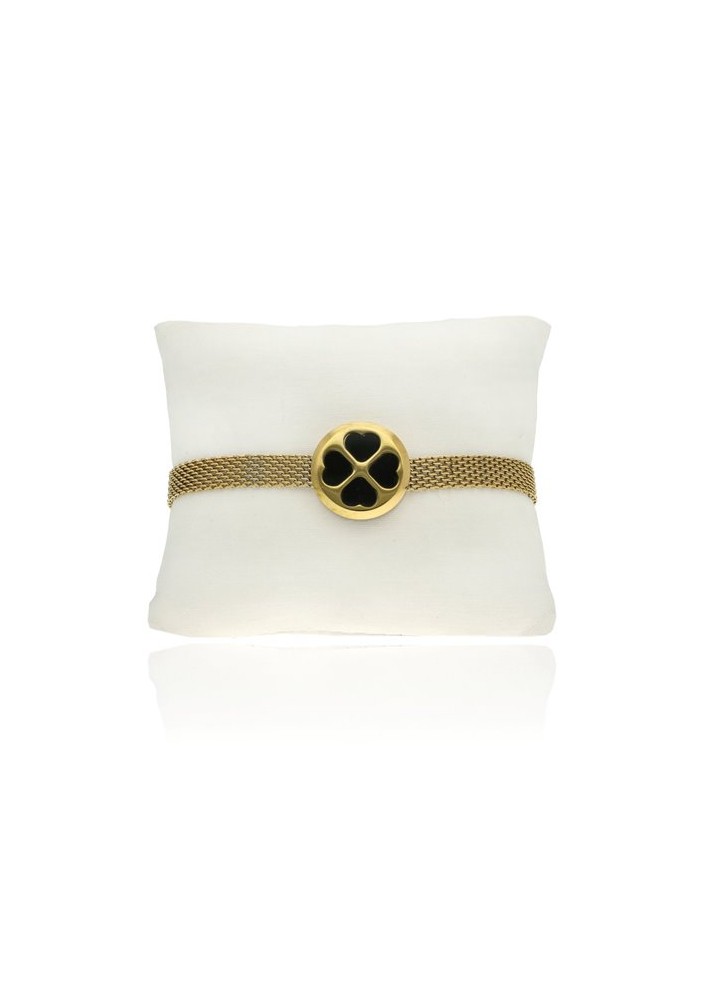Elegancka bransoletka Yvon wykonana ze stali szlachetnej łączy nowoczesny styl z ponadczasową symboliką. Złota, pleciona siateczka ozdobiona jest okrągłym medalionem z motywem czterolistnej koniczyny w czarnym kolorze – symbolem szczęścia, harmonii i kobiecej energii.