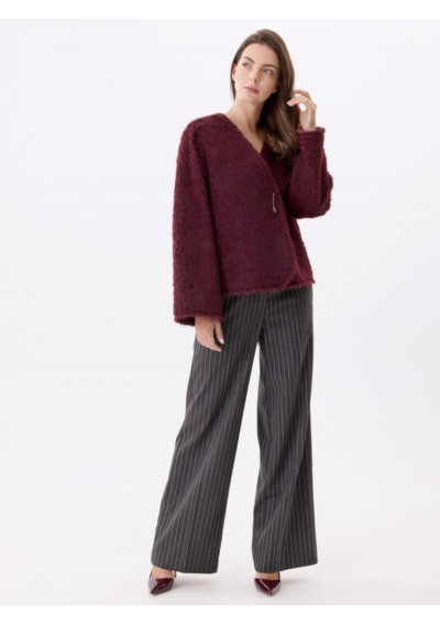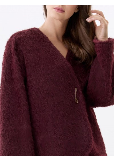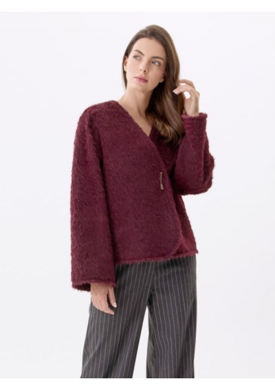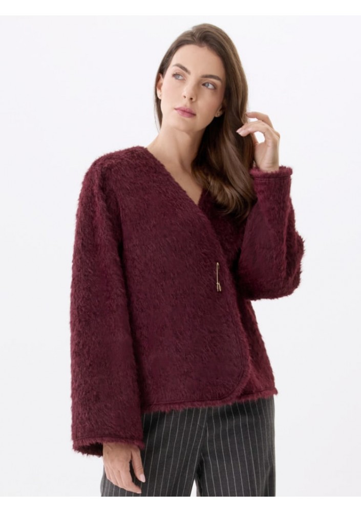 Bordowe futerko damskie Salko to stylowa propozycja pasująca do wielu stylizacji. Miękka, przyjemna w dotyku faktura oraz lekko oversizowy krój zapewniają pełen komfort i swobodę ruchów. Model zapinany na ozdobną, złotą agrafkę podkreśla nowoczesny, kobiecy charakter. Futerko świetnie prezentuje się zarówno w casualowych, jak i eleganckich stylizacjach – idealne do spodni, sukienek czy spódnic. Fason z lekko rozszerzanym rękawem.