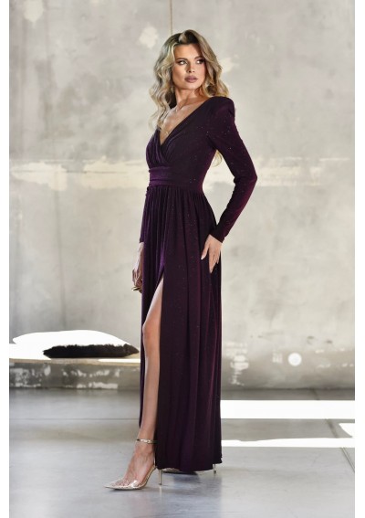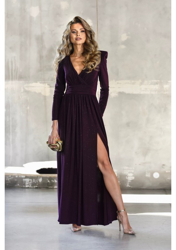 Przepiękna długa sukienka w korze śliwki. Długi rękaw, na ramionach wszyte poduszki. Z lewej strony rozporek.