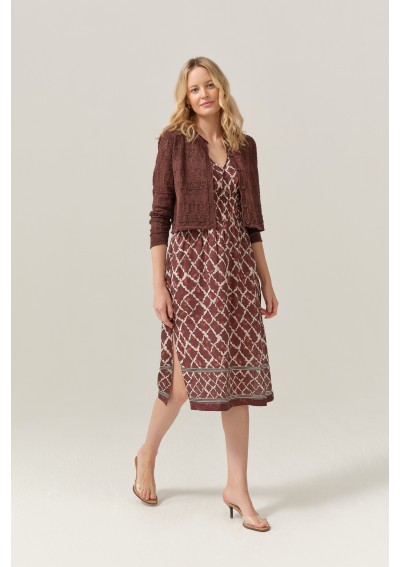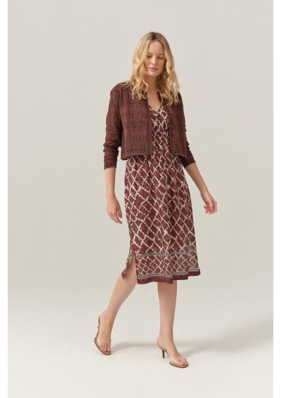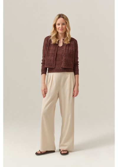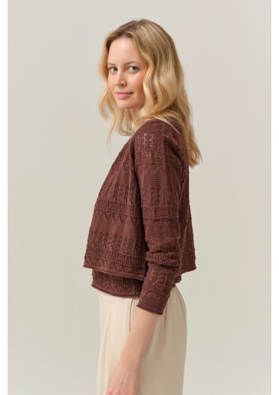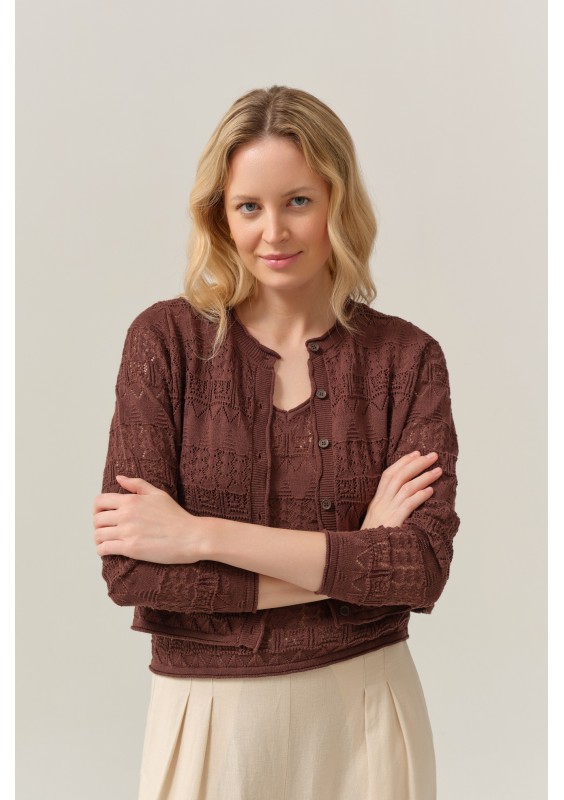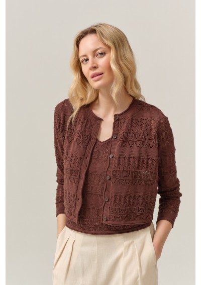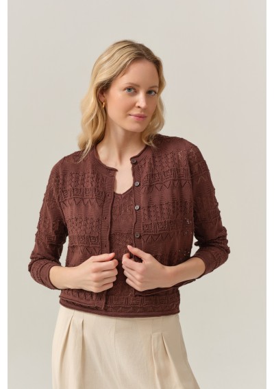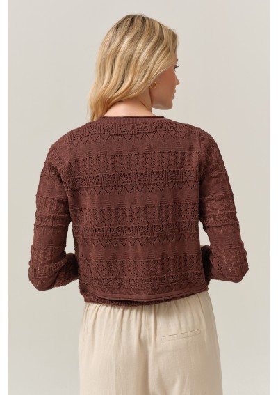 Sweter polskiej marki FERIA o ażurowym splocie w kolorze brązowym. Zapinany na guziki w tym samym kolorze. Krój pudełkowy, krótszy.