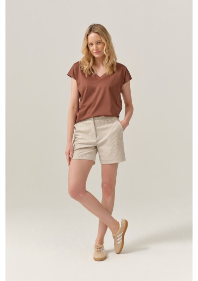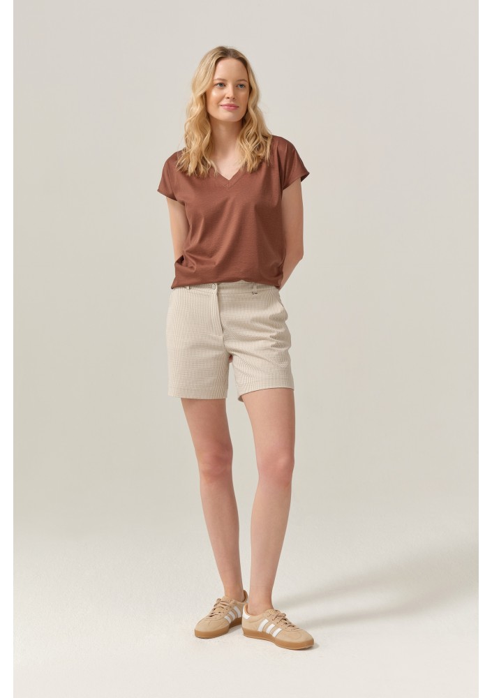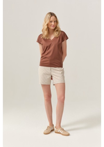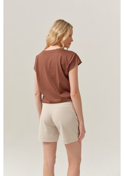 Bluzka posiada klasyczny dekolt w serek (V-neck), który subtelnie podkreśla szyję i wysmukla sylwetkę. Luźny, swobodny krój oraz krótki rękaw sprawiają, że model doskonale układa się na sylwetce i pasuje do wielu stylizacji. Ciepły odcień brązu pięknie komponuje się z jasnymi spodniami, szortami czy spódnicami.