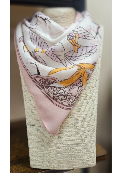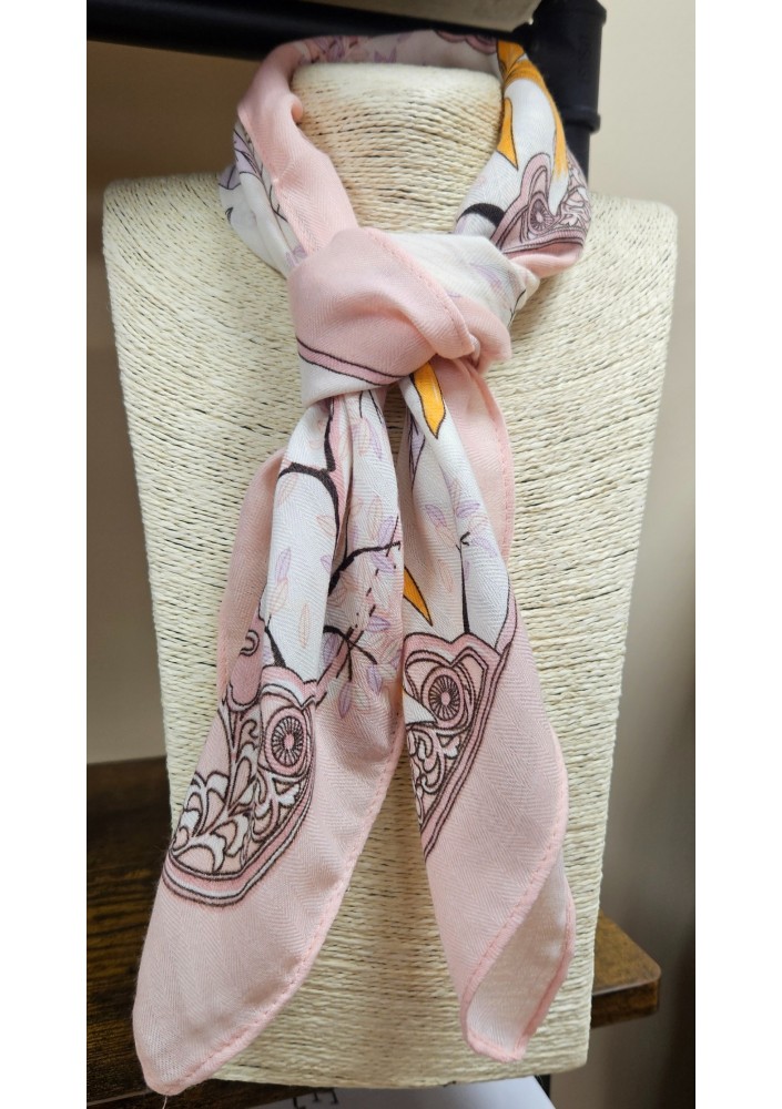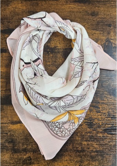 Elegancka apaszka damska typu gawroszka zachwyca delikatnym, roślinnym wzorem inspirowanym naturą. Połączenie odcieni jasnego beżu, pudrowego różu oraz subtelnych akcentów delikatnej pomarańczy tworzy harmonijną, bardzo kobiecą całość.