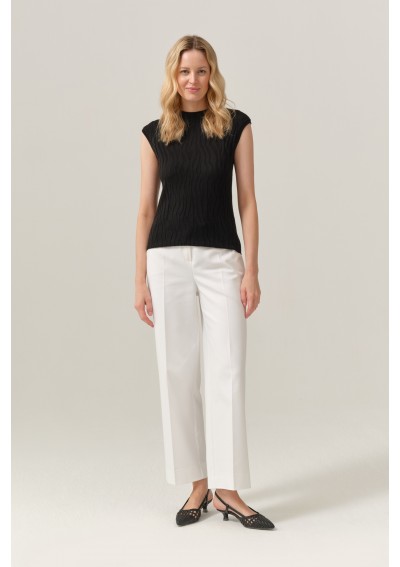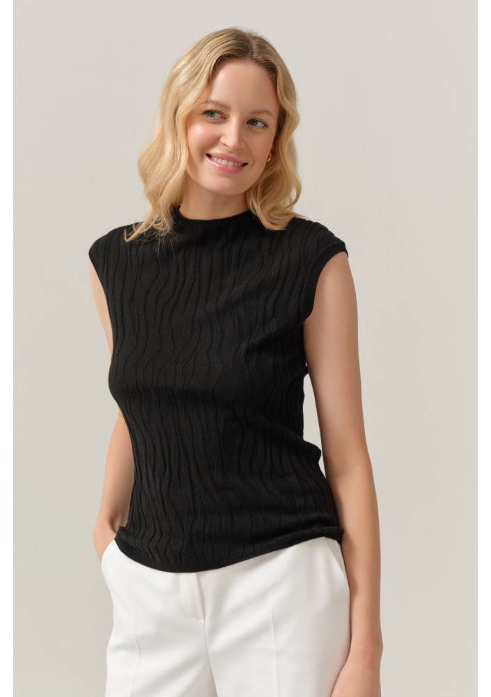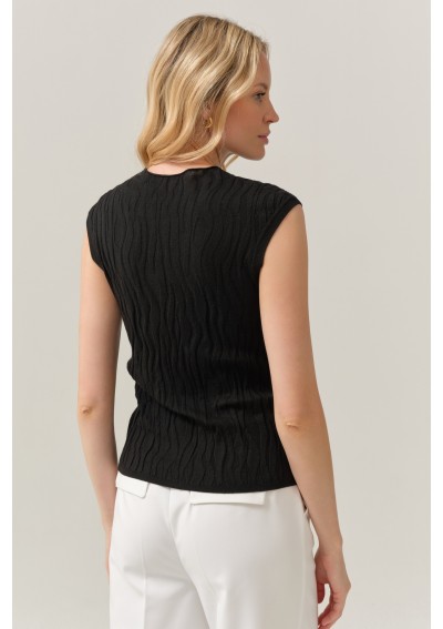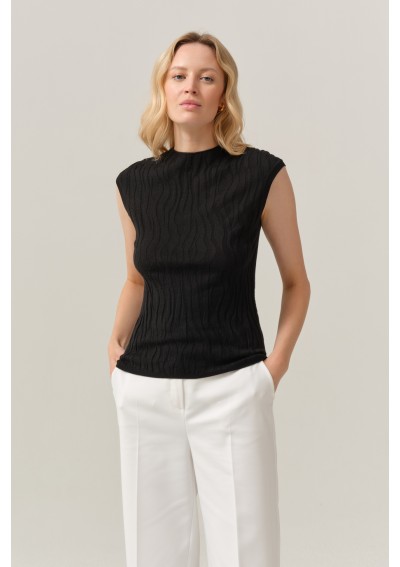 Top marki FERIA w klasycznej czerni to doskonały wybór dla kobiet ceniących minimalizm i wyrafinowany styl. Model bez rękawów wyróżnia się delikatną, strukturalną fakturą materiału, która dodaje całości elegancji i nowoczesnego charakteru.
