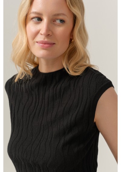 Czarny top marki FERIA to elegancka i ponadczasowa propozycja do wielu stylizacji. Subtelna faktura materiału i prosty fason bez rękawów podkreślają kobiecą sylwetkę i zapewniają komfort noszenia. Dzianina dopasowuje się do sylwetki.