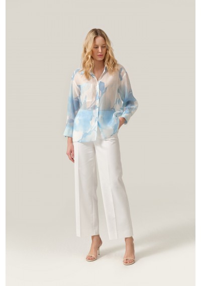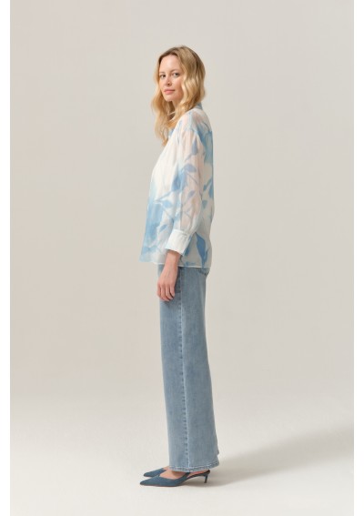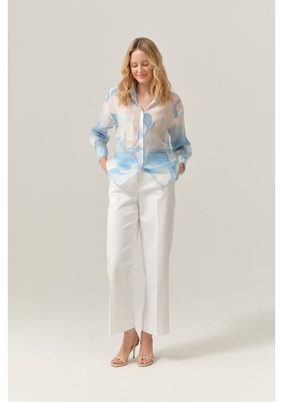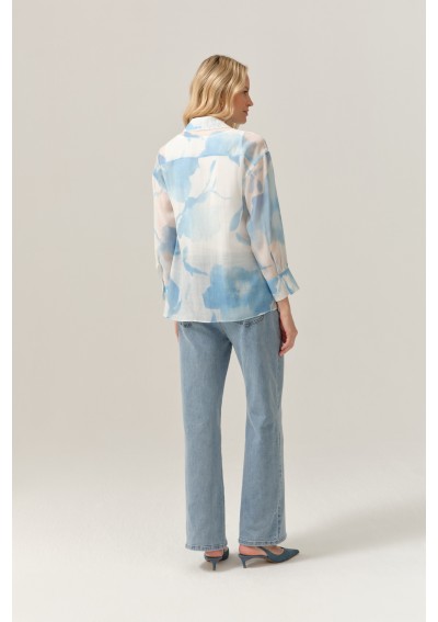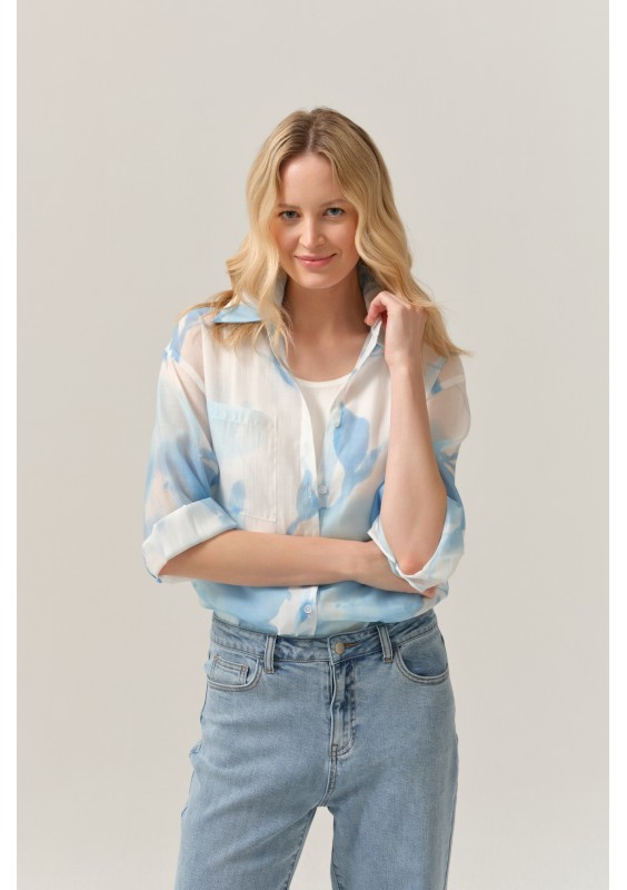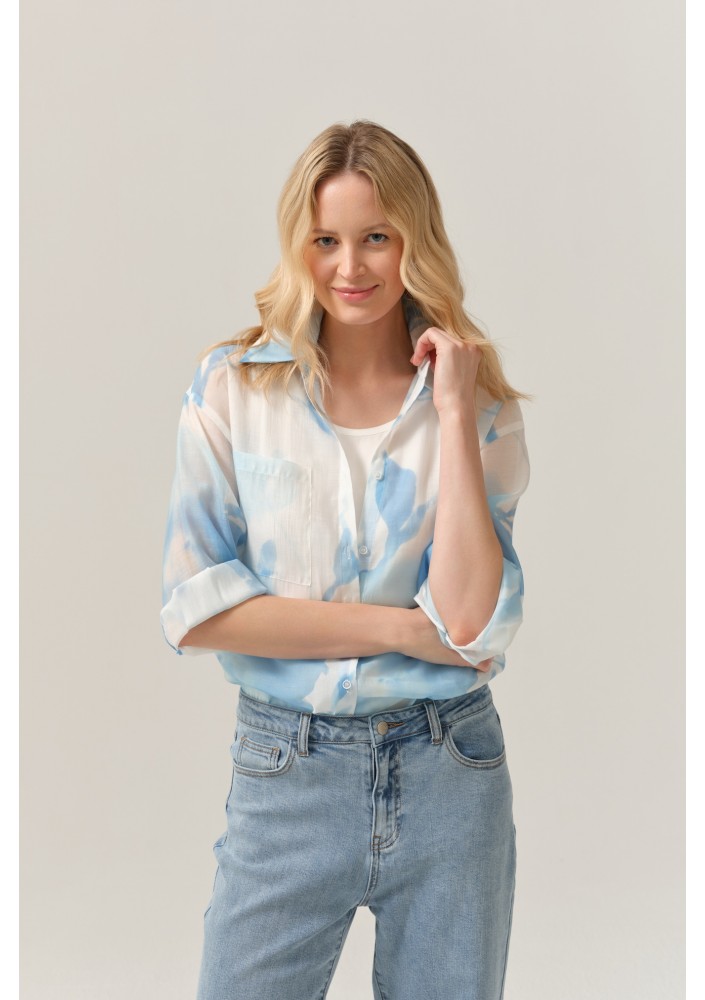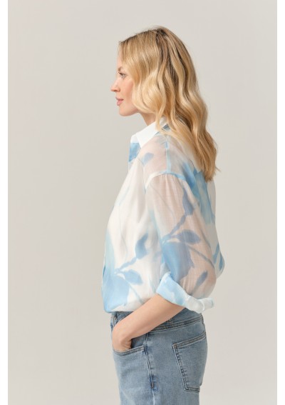 Wykonana z przyjemnej w dotyku, przewiewnej tkaniny, doskonale sprawdzi się zarówno w codziennych stylizacjach, jak i w bardziej dopracowanych zestawach. Klasyczny kołnierzyk, luźniejszy fason i możliwość podwinięcia rękawów nadają jej swobodnego, ale wciąż bardzo kobiecego charakteru.to połączenie kobiecej lekkości i nowoczesnej elegancji. Model wykonany z delikatnej, półtransparentnej tkaniny zachwyca biało-niebieskim wzorem inspirowanym akwarelą, który nadaje całości świeżości i subtelnego charakteru.
