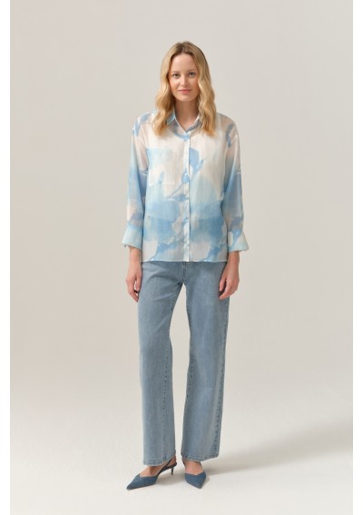 Koszula damska marki FERIA zachwyca delikatną kolorystyką inspirowaną niebem i wodą. Błękitny odcień działa uspokajająco i wprowadza harmonię, a miękki, akwarelowy print dodaje całości lekkości oraz nowoczesnej elegancji.