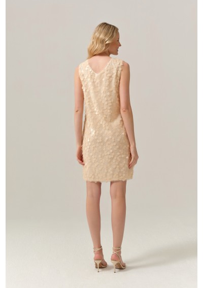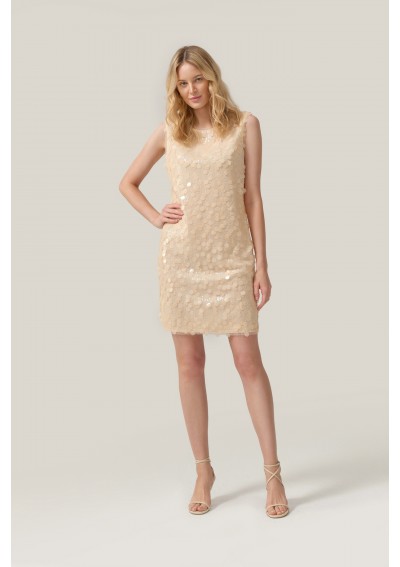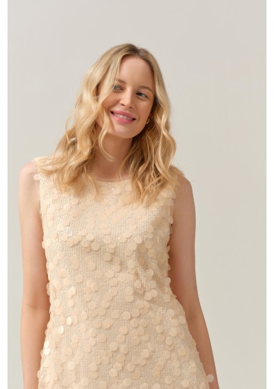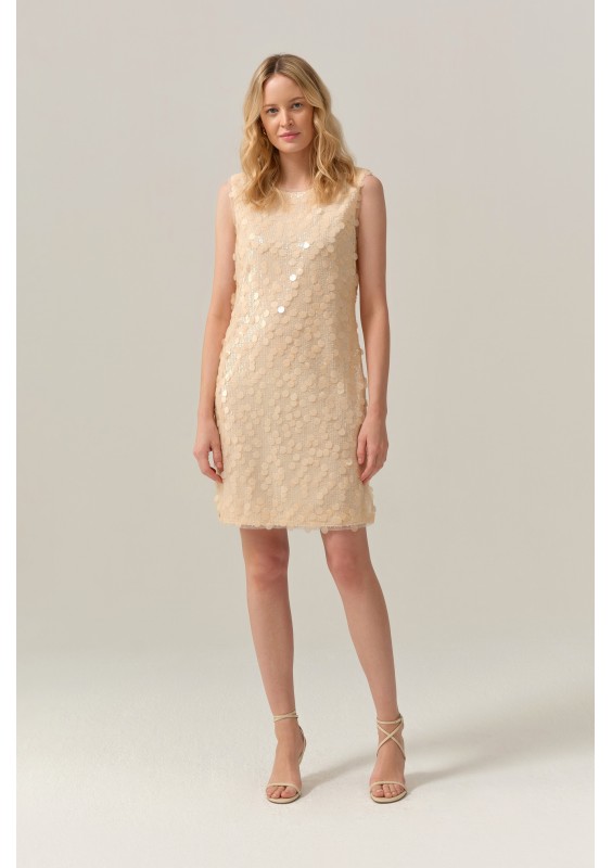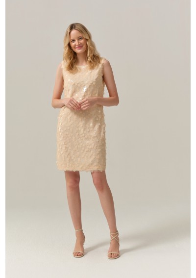 Elegancka sukienka marki FERIA w delikatnym, beżowym odcieniu, ozdobiona drobnymi, subtelnie połyskującymi cekinami w mniejszym i większym rozmiarze. Sukienka z podszewką, bo bokach dwa krótkie rozporki.