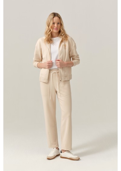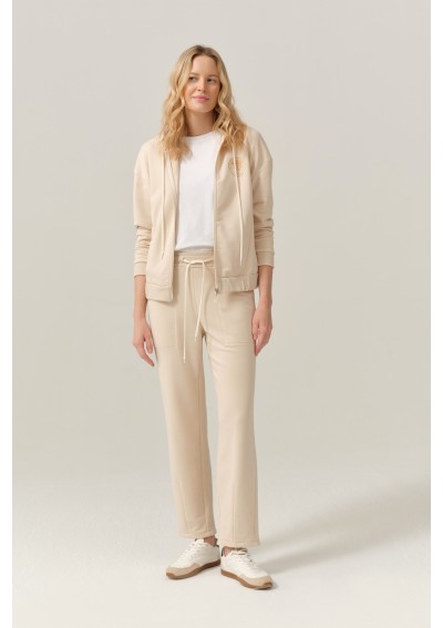 Stylowa bluza damska marki FERIA w jasnym, beżowym odcieniu. Rozpinana, z kapturem i subtelnym detalem firmowym.