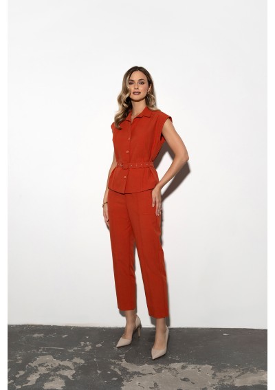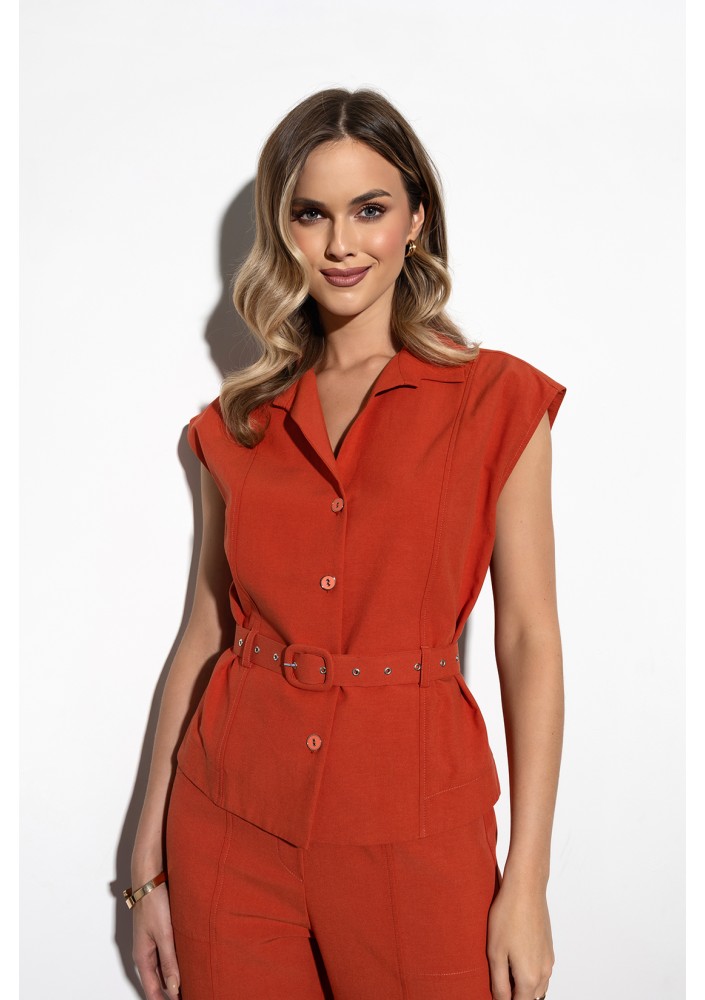 Elegancka kamizelka damska marki ZAPS w modnym, ceglastym kolorze to stylowa alternatywa dla klasycznego żakietu. Model z kołnierzem i paskiem pięknie podkreśla talię, dodając sylwetce lekkości i kobiecego charakteru. Prosty fason.