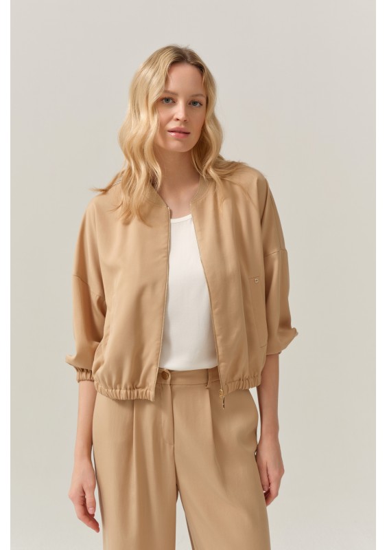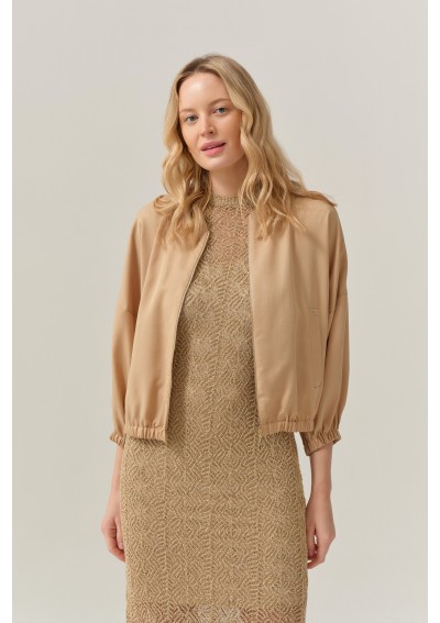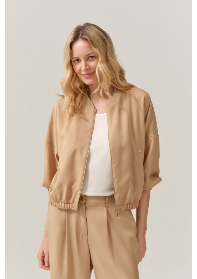 Bomberka w kolorze ciepłego beżu polskiej marki FERIA. Model zapinany na suwak. Rękawy i dół zakończone ściągaczami. Góra bomberki zakończona sweterkiem w kolorze kurtki z dodatkiem złotej nitki.