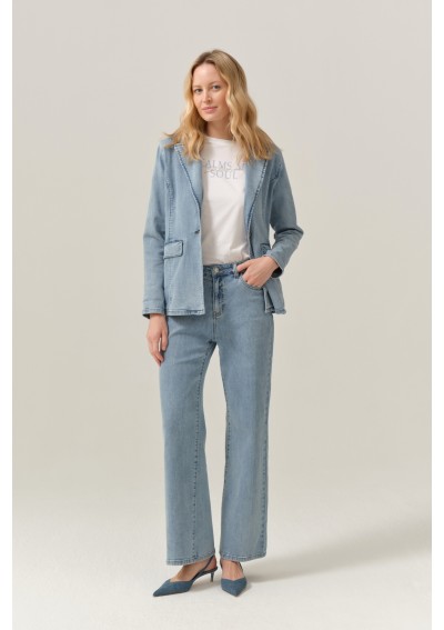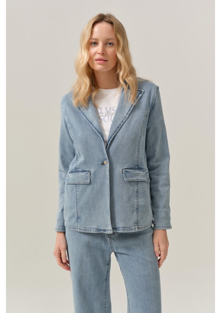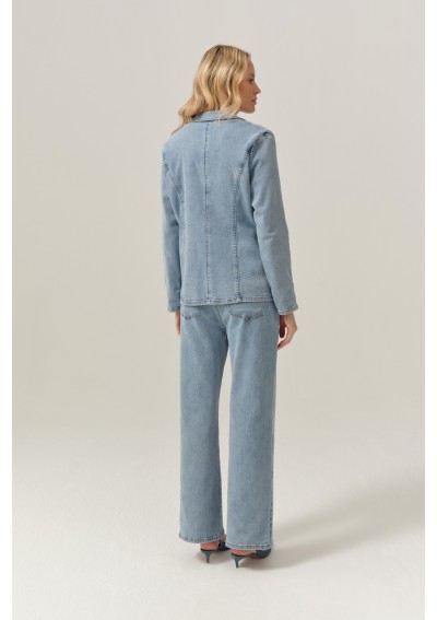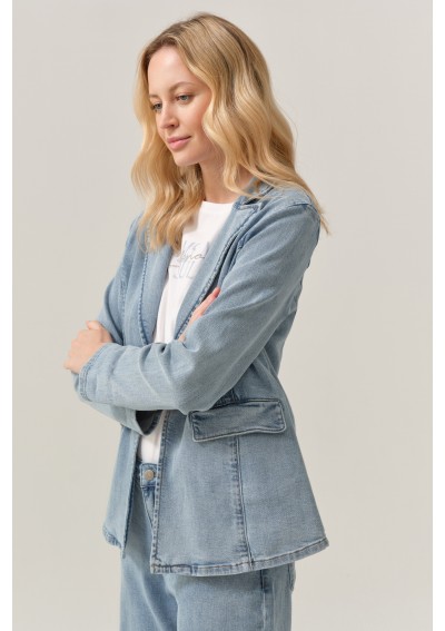 Wykonany z miękkiego, przyjemnego w noszeniu denimu, żakiet doskonale układa się na sylwetce i zapewnia komfort przez cały dzień. Klasyczny krój z klapami nadaje mu eleganckiego charakteru, natomiast jeansowa tkanina przełamuje formalność, tworząc nowoczesny i bardzo uniwersalny element stylizacji.