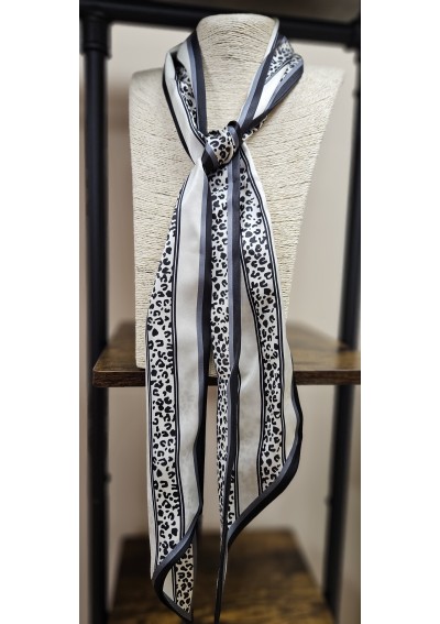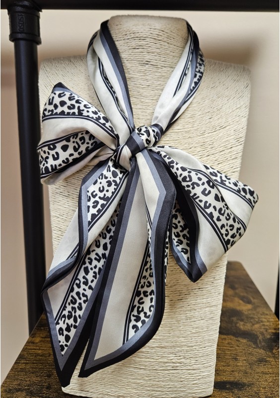 Elegancka krawatka damska w odcieniu beżu z czarnym printem zwierzęcym i kontrastową lamówką.