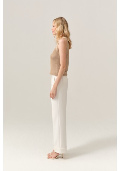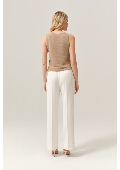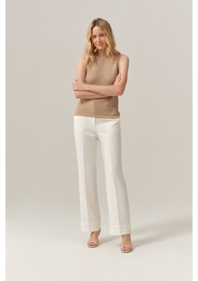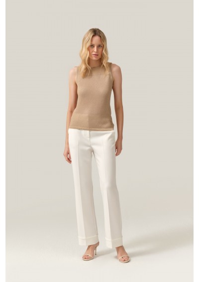 Top posiada klasyczny, zabudowany dekolt oraz brak rękawów, dzięki czemu pięknie eksponuje ramiona i sprawdza się w wielu stylizacjach – zarówno w eleganckim wydaniu, jak i w codziennych zestawach. Delikatny połysk dzianiny dodaje mu szlachetności, a elastyczny materiał zapewnia wygodę noszenia przez cały dzień.