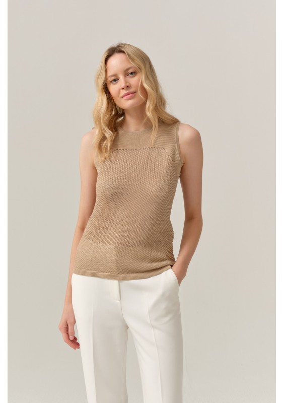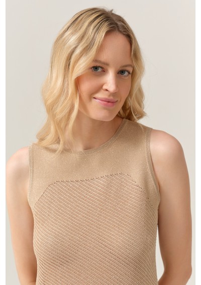 Top polskiej marki FERIA z dzianiny o strukturalnym, trójwymiarowym splocie. Kolor beżowy z połyskującą nitką. Elastyczna.