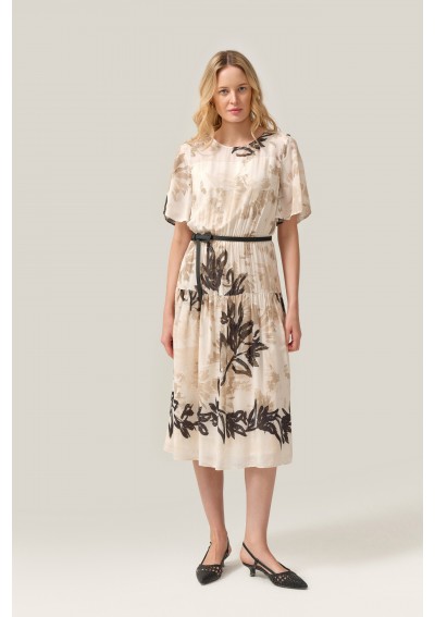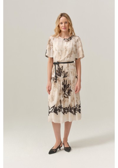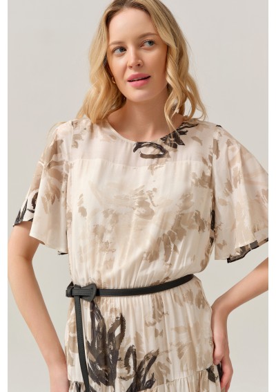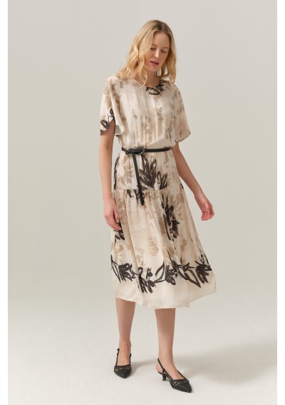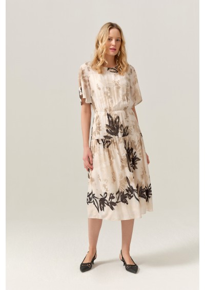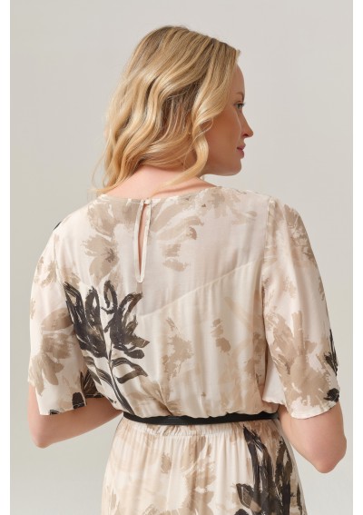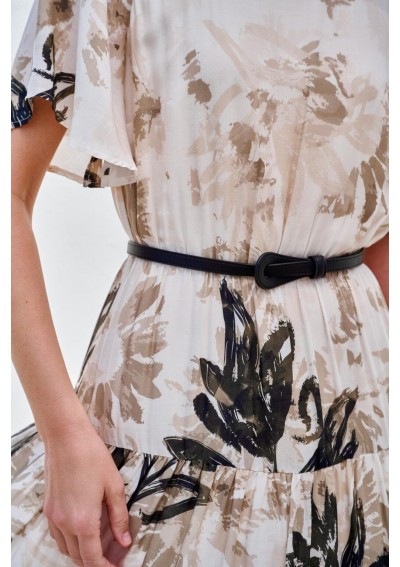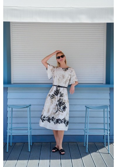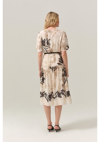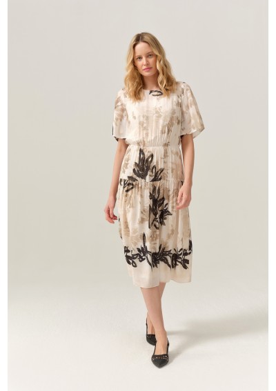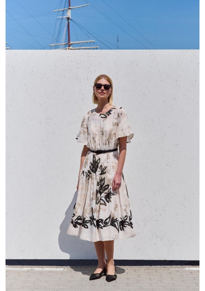 Stylowa sukienka midi marki FERIA to połączenie elegancji, wygody i subtelnej kobiecości. Jasna kolorystyka w odcieniach beżu została uzupełniona delikatnym, artystycznym printem, który nadaje sukience wyjątkowego charakteru i sprawia, że model przyciąga uwagę swoją lekkością.