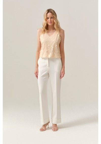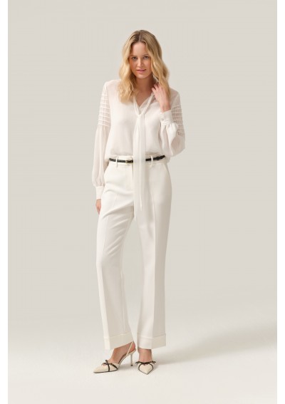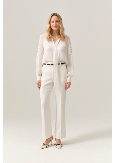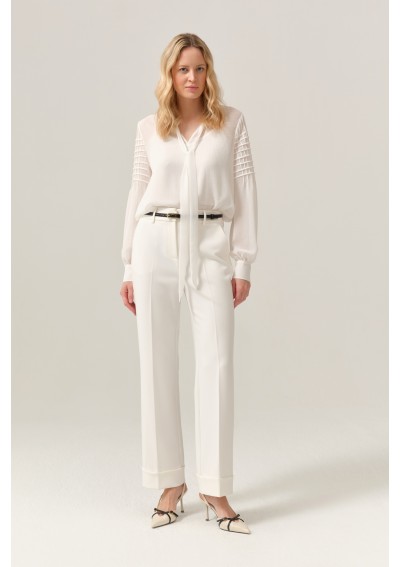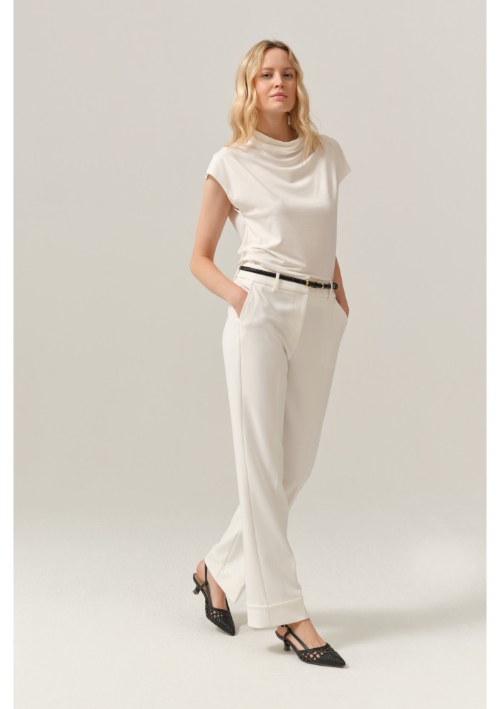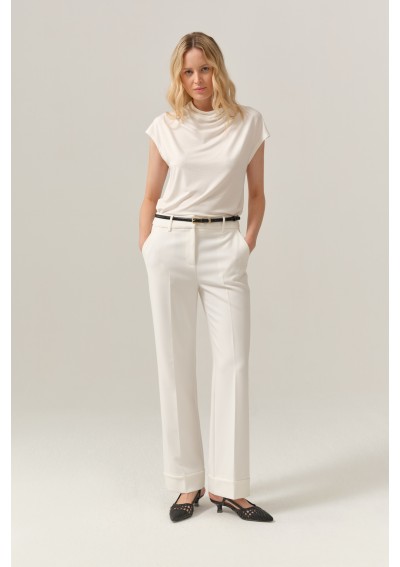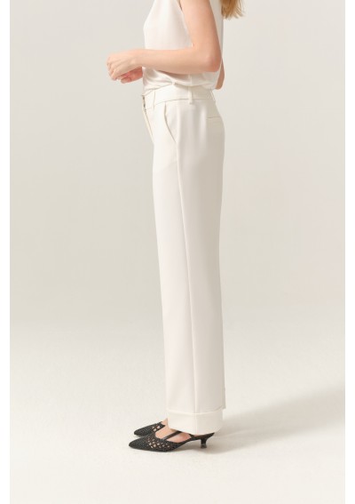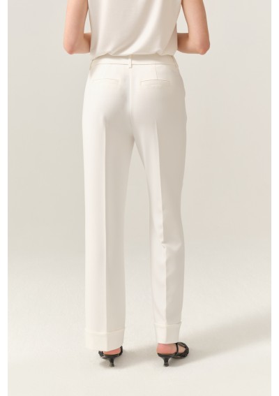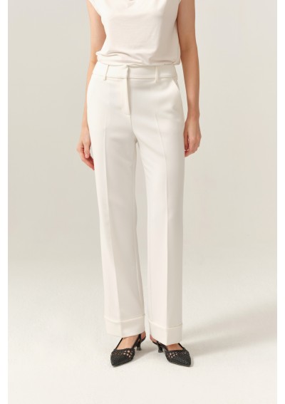 Eleganckie spodnie damskie marki FERIA w ponadczasowym kolorze śmietankowej bieli. Klasyczna prosta nogawka z kantem pięknie wydłuża sylwetkę i zapewnia elegancki wygląd. Nogawka zakończona szerokim mankietem.