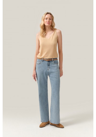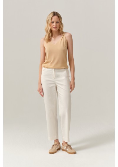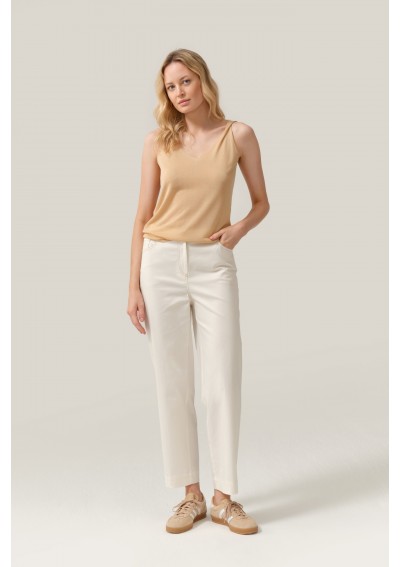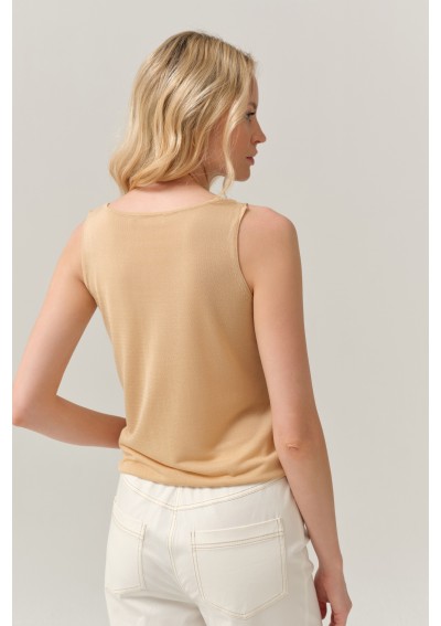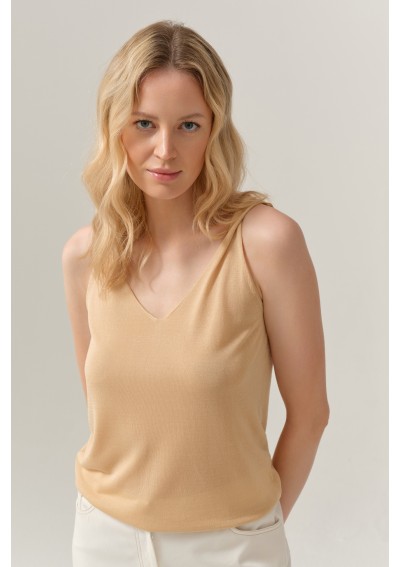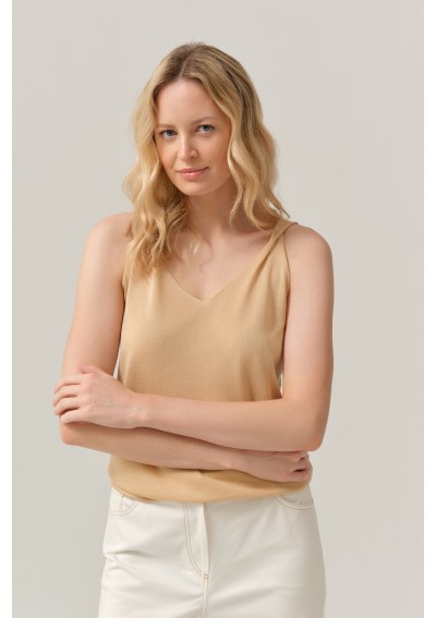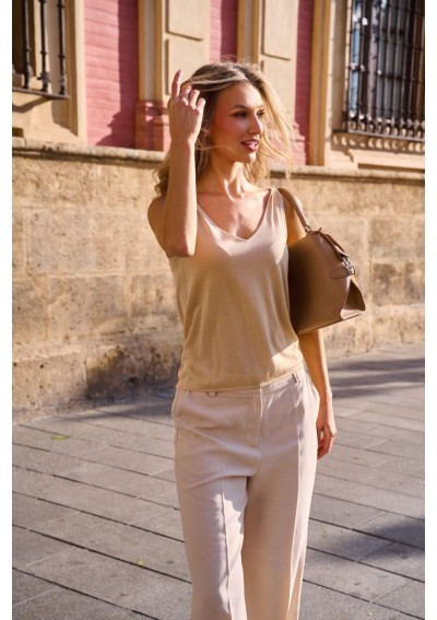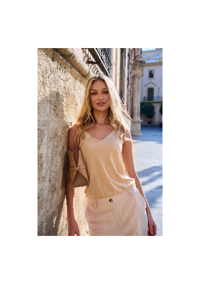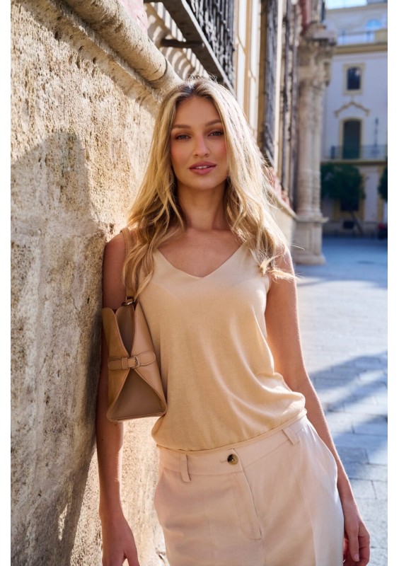 Minimalistyczny top damski marki FERIA w eleganckim, ciepłym odcieniu beżu. Lekki materiał i subtelny dekolt w kształcie litery V nadają mu kobiecy i ponadczasowy charakter.