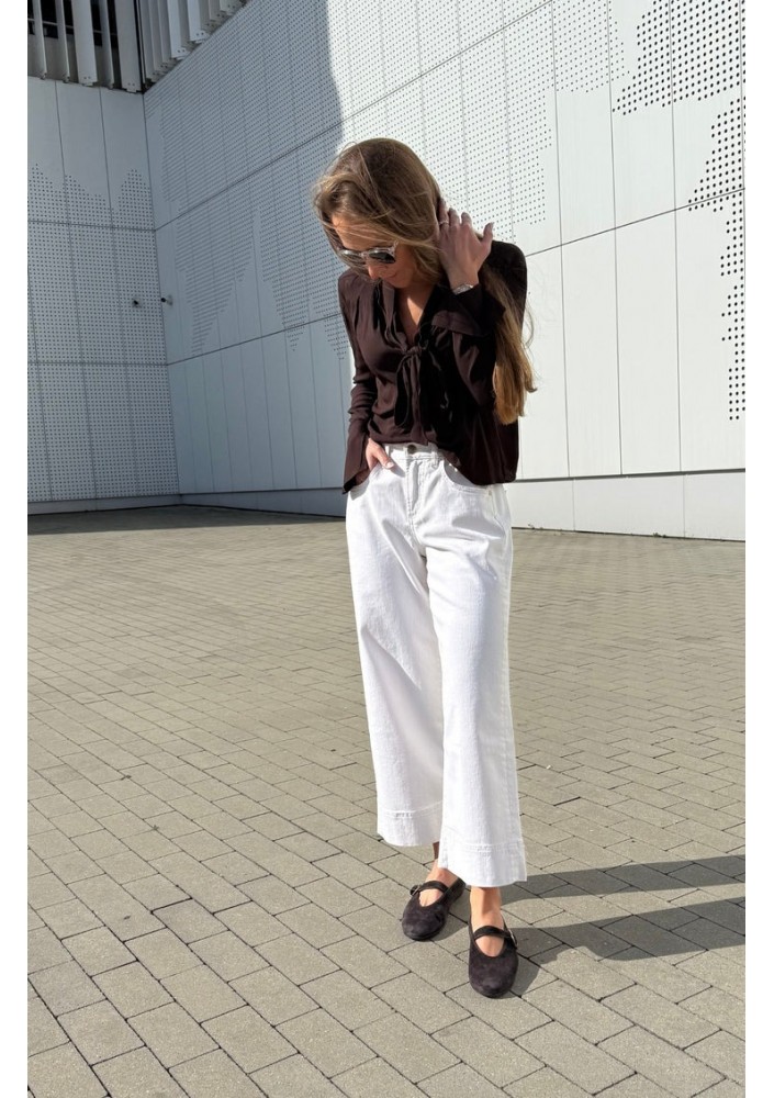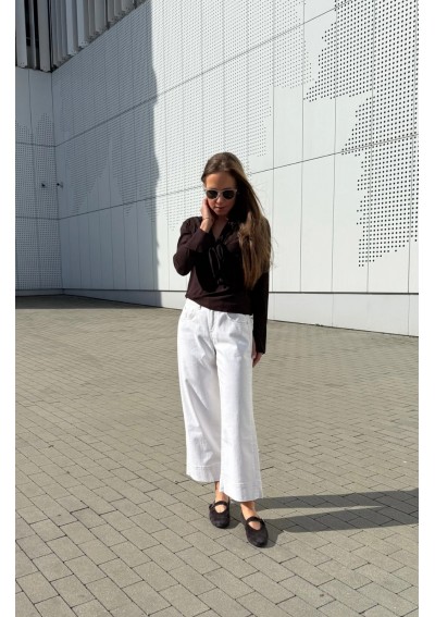 Model o długości 7/8 z szeroką nogawką i wyraźnie podkreślonym mankietem to modna propozycja na co dzień, do pracy czy na spotkania ze znajomymi.