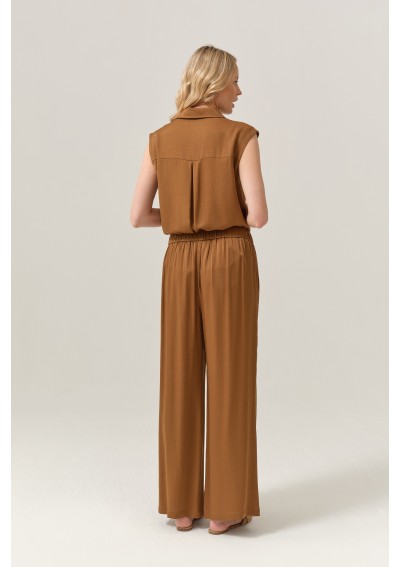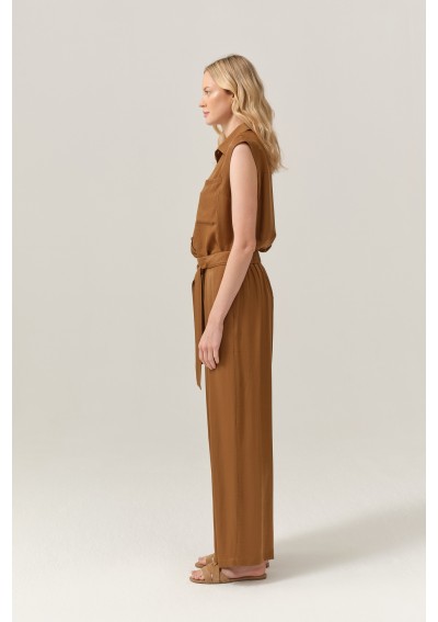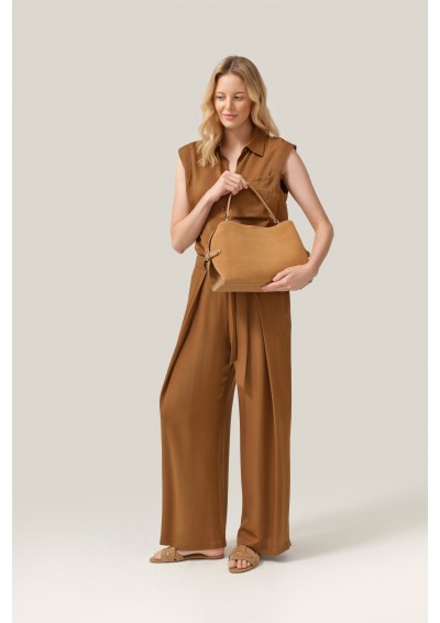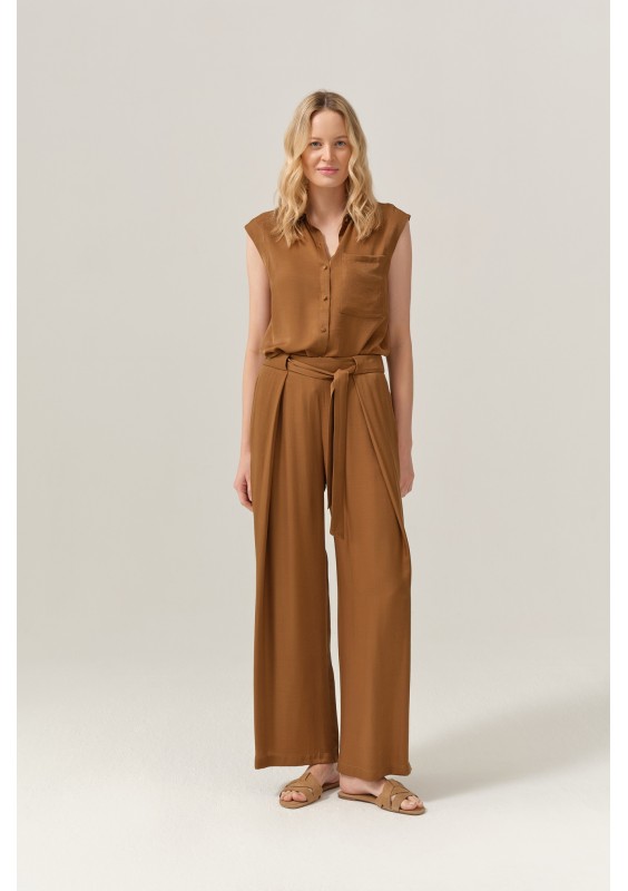 Spodnie zostały wykonane z miękkiego, lejącego materiału, który subtelnie pracuje podczas ruchu i zapewnia wysoki komfort noszenia. Wysoki stan oraz szeroki pasek z efektownym wiązaniem podkreślają talię, dodając stylizacji kobiecego charakteru.