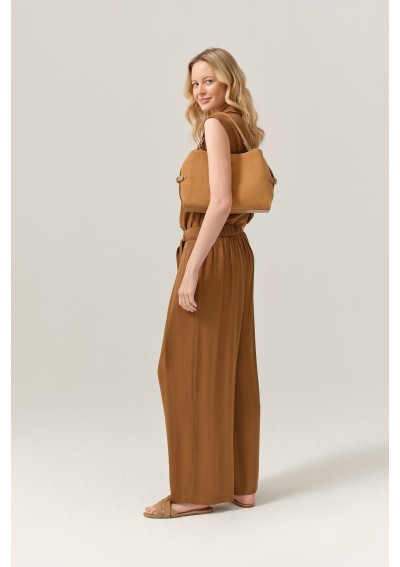 Eleganckie spodnie damskie polskiej marki FERIA z szeroką nogawką i wiązaniem w pasie. Model z wysokim stanem oraz wiązaniem w pasie pięknie podkreśla talię i wysmukla sylwetkę. Lekki, lejący materiał sprawia, że spodnie doskonale układają się w ruchu i nadają stylizacji wyjątkowej lekkości. W pasie z tyłu wszyta elastyczna guma.