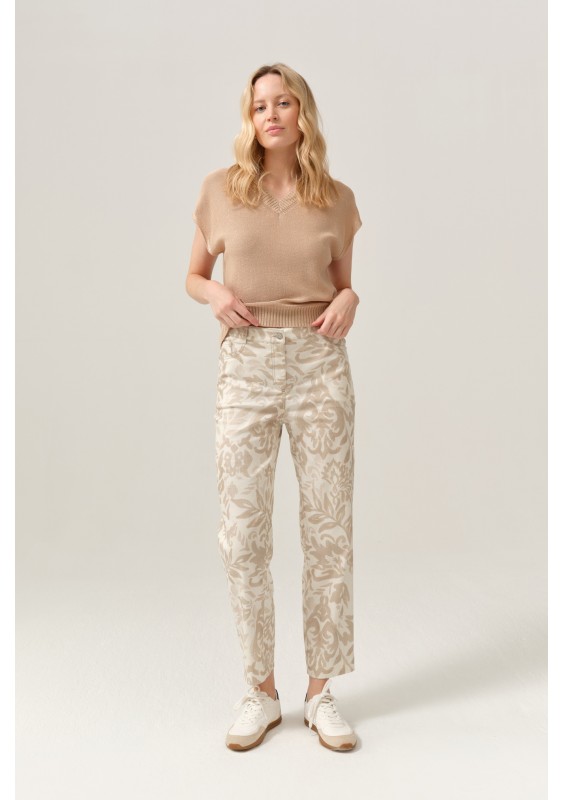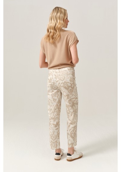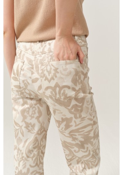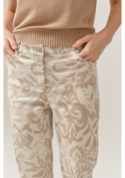 Spodnie damskie marki FERIA to wyjątkowa propozycja dla kobiet, które lubią wyróżniać się subtelną elegancją. Model zachwyca delikatnym, ornamentowym wzorem w odcieniach beżu i ecru, który nadaje stylizacji lekkości i niepowtarzalnego charakteru.