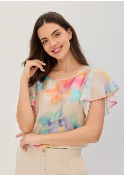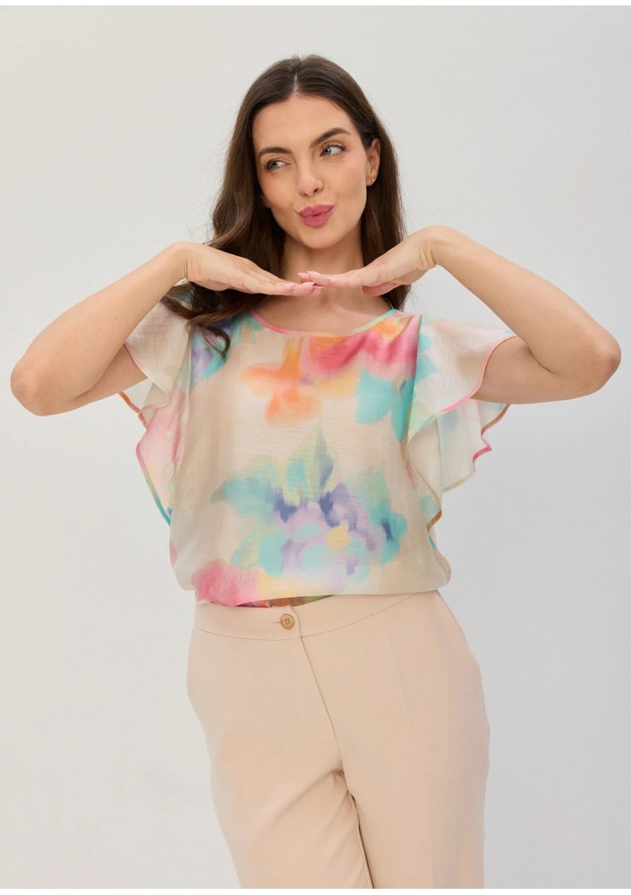 Bluzka polskiej marki SALKO w akwarelowy deseń w pastelowej kolorystyce. Okrągły dekolt. Klasycznie wszyte, krótkie, falbankowe rękawy. Fason odstawiony od sylwetki, wygodny.