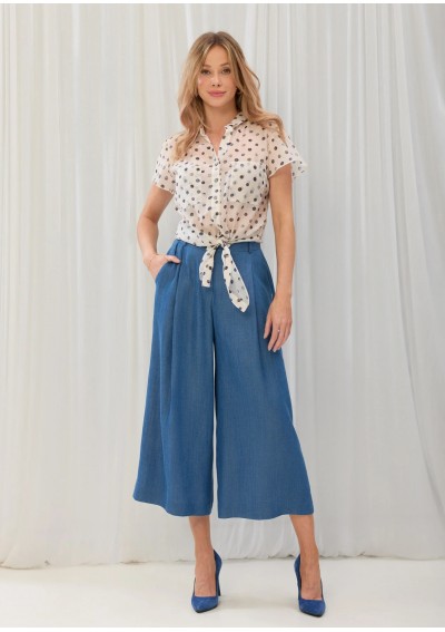 Bluzka w akwarelowe, granatowo-szare kropki polskiego producenta Salko. Model charakteryzuję się dekoltem z kołnierzykiem, kieszeniami na wysokości biustu oraz krótkim rękawem. Przód jest lekko przedłużony, co daje możliwość wiązania. Z tyłu karczek z kontrafałdą. Tkanina lekko transparentna.