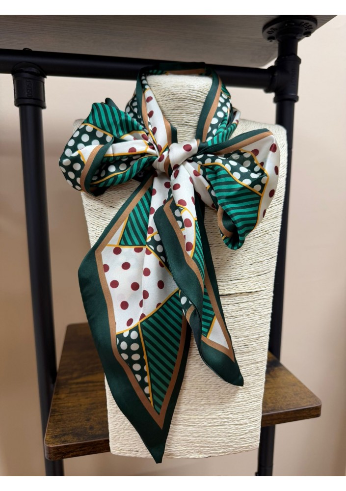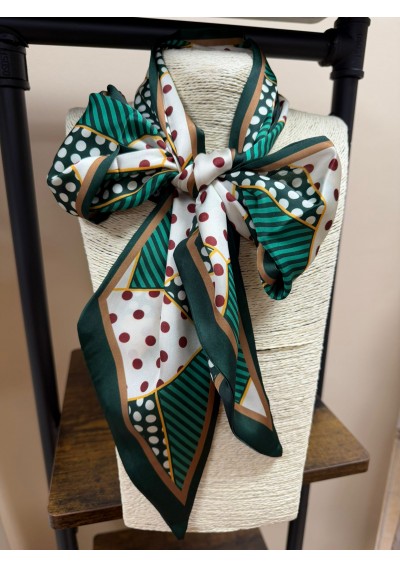 Wyrazista krawatka damska w odcieniach zieleni z modnym geometrycznym wzorem i groszkami.