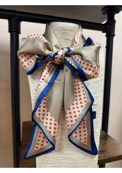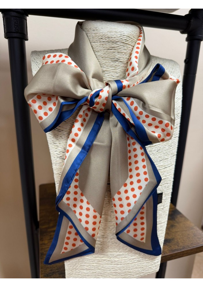Elegancka krawatka damska w groszki w odcieniach beżu z kontrastową granatową lamówką i pomarańczowymi groszkami.