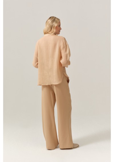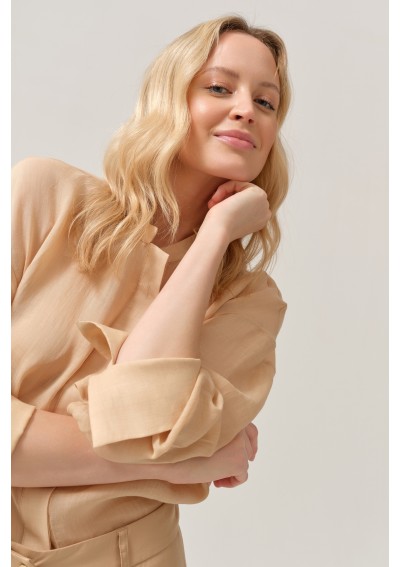 Naturalny, subtelny odcień beżu sprawia, że koszula jest niezwykle uniwersalna – doskonale komponuje się zarówno z jasnymi, jak i bardziej kontrastowymi elementami garderoby. Świetnie wygląda w zestawieniu z eleganckimi spodniami, jak i w casualowej stylizacji z jeansami.
