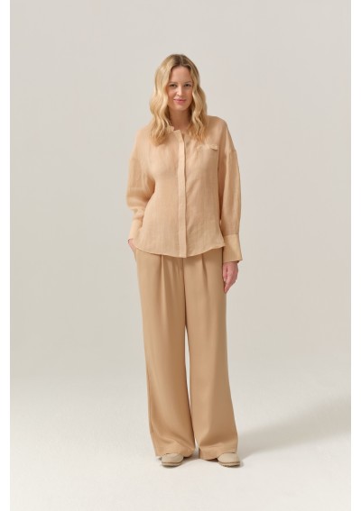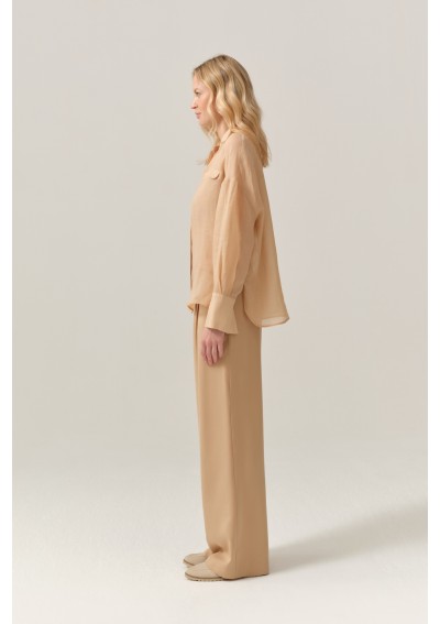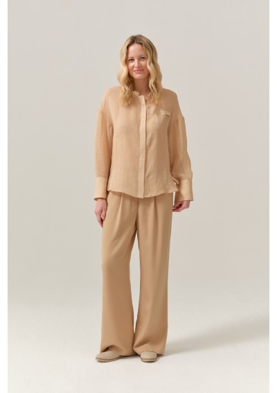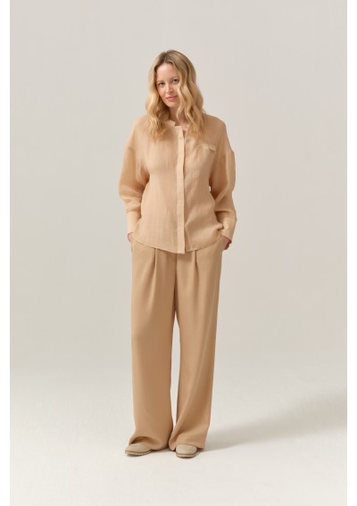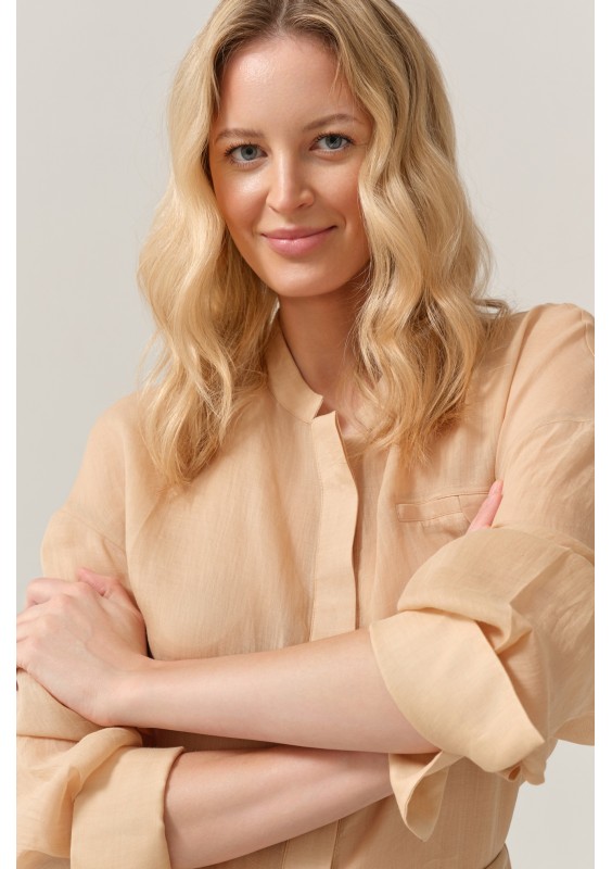 Lekka, transparentna koszula polskiej marki FERIA w odcieniu jasnego beżu. Wykonana z półprzezroczystej tkaniny, o miękkim, naturalnym chwycie. Model charakteryzuję się minimalistycznym kołnierzykiem bez stójki, krytym zapięciem oraz drobną kieszonką z klapką.