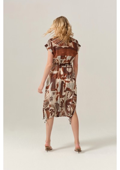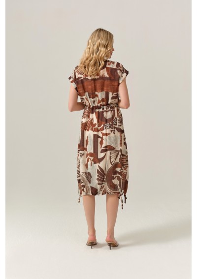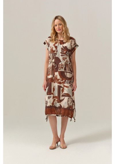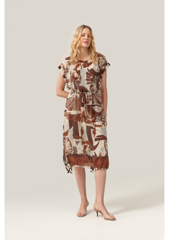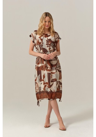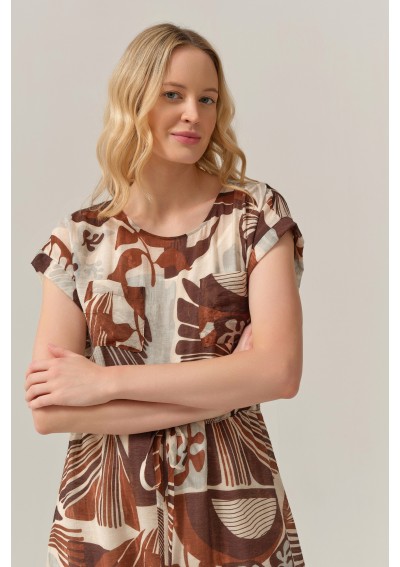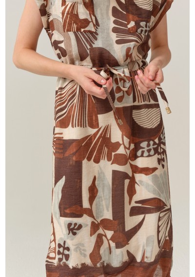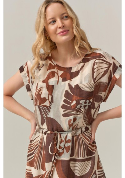 Stylowa sukienka marki FERIA to idealna propozycja dla kobiet, które kochają naturalność, wygodę i oryginalny design. Model o długości midi zachwyca wyjątkowym, artystycznym printem w ciepłych odcieniach beżu i brązu, który pięknie wpisuje się w letnie i casualowe stylizacje.